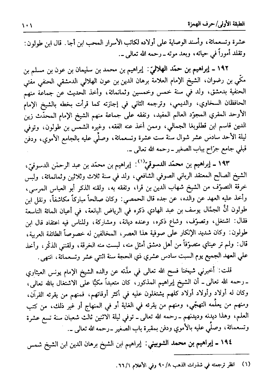 193 - إبراهيم بن محمد الدسوقي: إبراهيم بن محمد بن عبد الرحمن الدسوقي، الشيخ الصالح المعتقد الرباني الصوفي الشافعي، ولد في سنة ثلاث وثلاثين وثمانمائة، ولبس خرقة التصوف من الشيخ شهاب الدين بن قرا، وتفقه به، ولقنه الذكر أبو العباس المرسي، وأخذ عليه العهد عن والده، عن جده قال الحمصي: وكان صالحاً مباركاً مكاشفاً، ونقل ابن طولون أن الجمال يوسف بن عبد الهادي ذكره في الرياض اليانعة، في أعيان المائة التاسعة فقال: اشتغل، وتصوف، وشاع ذكره، وعنده ديانة، ومشاركة، وللناس فيه اعتقاد قال ابن طولون: وكان شديد الإنكار على صوفية هذا العصر، المخالفين له خصوصاً الطائفة العربية، قال: ولم تر عيناي متصوفاً من أهل دمشق أمثل منه، لبست منه الخرقة، ولقنني الذكر، وأخذ علي العهد الجميع يوم السبت سادس عشري في الحجة سنة اثنتي عشر وتسعمائة، انتهى.