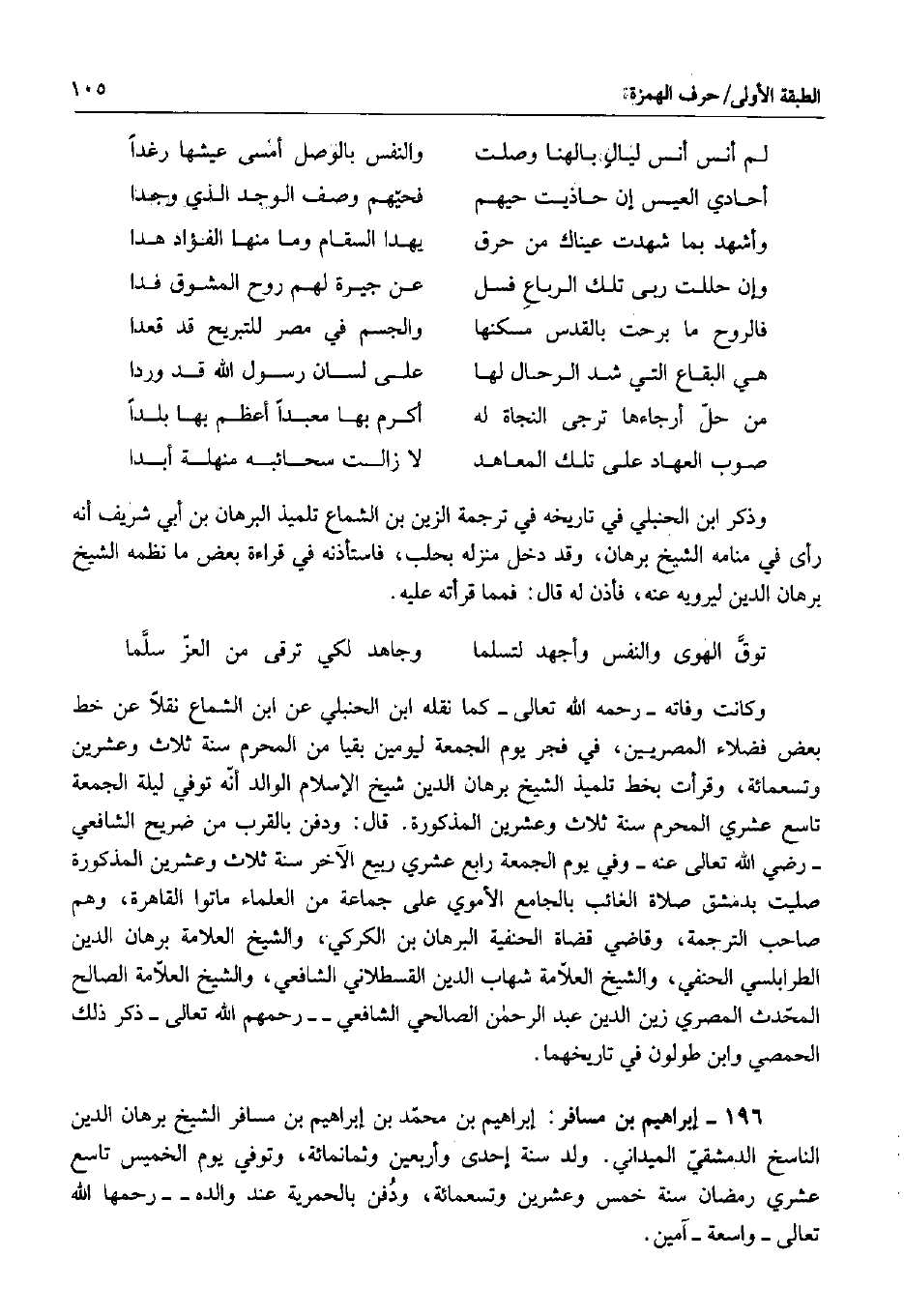 196 - إبراهيم بن مسافر: إبراهيم بن محمد بن إبراهيم بن مسافر الشيخ برهان الدين الناسخ الدمشقي الميداني. ولد سنة إحدى وأربعين وثمانمائة، وتوفي يوم الخميس تاسع عشري رمضان سنة خمس وعشرين وتسعمائة، ودفن بالحمرية عند والده - رحمها " الله تعالى - رحمة - واسعة - آمين.