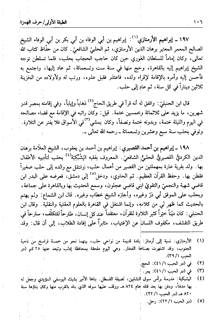 197 - إبراهيم الأرمنازي: إبراهيم بن أبي الوفاء بن أبي بكر بن أبي الوفاء الشيخ الصالح المعمر المعتبر برهان الدين الأرمنازي، ثم الحلبي الشافعي. كان من حفاظ كتاب الله تعالى، وكان إماماً للسلطان الغوري حين كان حاجب الحجاب بحلب، فلما تسلطن توجه الشيخ إيراهيم إليه بالقاهرة، وحج منها في سنة ست وتسعمائة، ثم عاد إليها، واجتمع به فأحسن إليه وأمره بالإقامة لإقراء ولده، فاعتذر فقبل عذره، ورتب له ولأولاده من الخزينة ثلاثين ديناراً في كل سنة، ثم عاد إلى حلب.