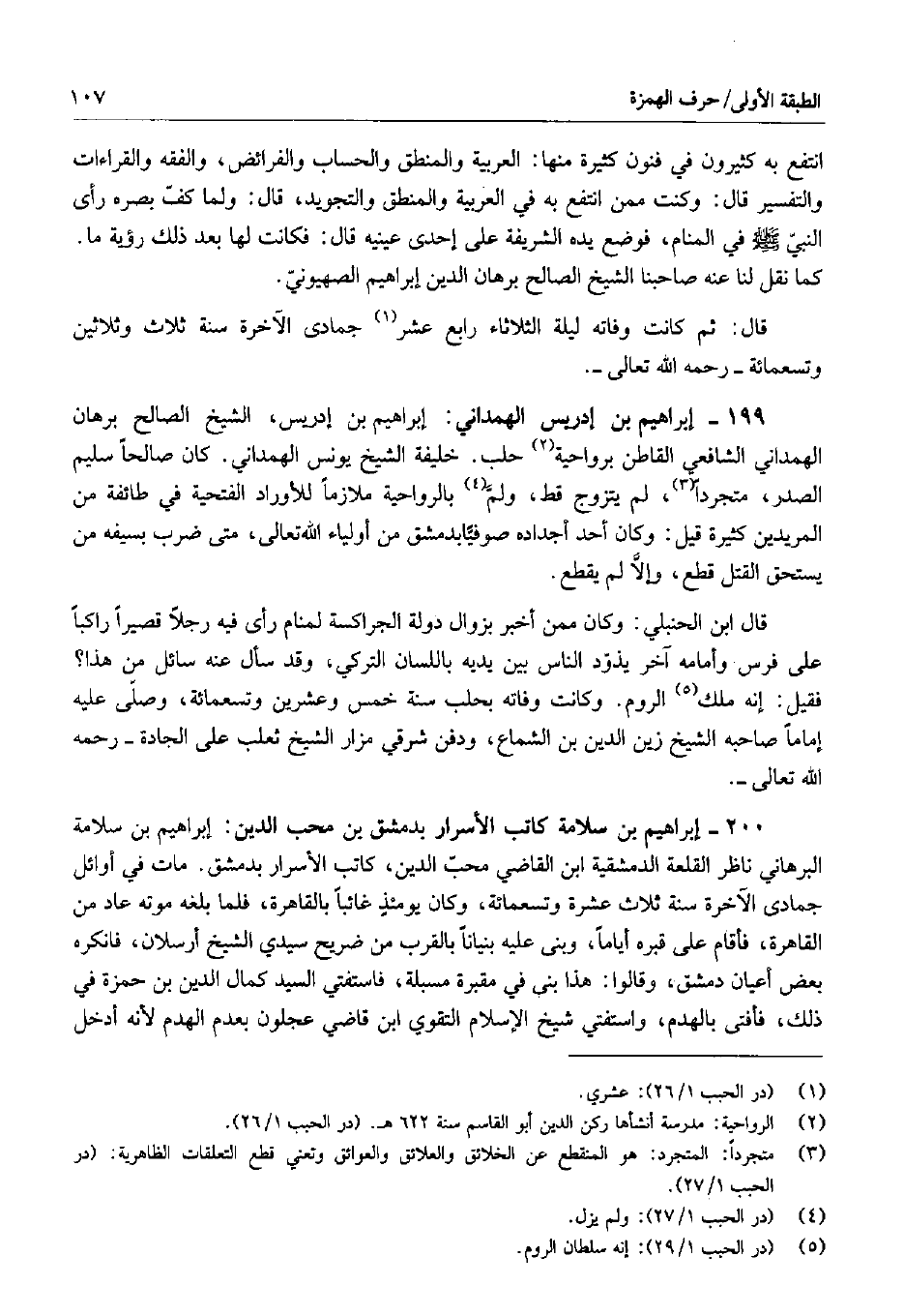 199 - إبراهيم بن إدريس الهمداني: إبراهيم بن إدريس، الشيخ الصالح برهان، الهمداني الشافعي القاطن برواحية حلب. خليفة الشيخ يونس الهمداني. كان صالحاً سليم الصدر، متجرداً، لم يتزوج قط، ولم بالرواحية ملازماً للأوراد الفتحية في طائفة من المريدين كثيرة قيل: وكان أحد أجداده صوفياً بدمشق من أولياء الله تعالى، متى ضرب بسيفه من يستحق القتل قطع، وإلا لم يقطع.
