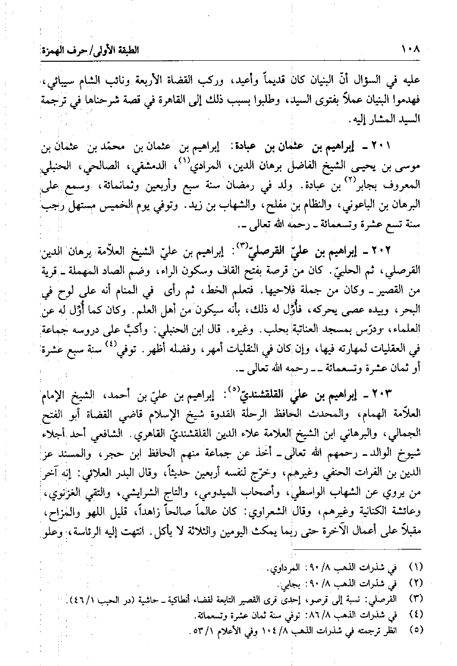 203 - إبراهيم بن علي القلقشندي: إبراهيم بن علي بن أحمد، الشيخ الإمام العلامة الهمام، والمحدث الحافظ الرحلة القدوة شيخ الإسلام قاضي القضاة أبو الفتح الجمالي، والبرهاني ابن الشيخ العلامة علاء الدين القلقشندي القاهري. الشافعي أحد أجلاء شيوخ الوالد - رحمهم الله تعالى - أخذ عن جماعة منهم الحافظ ابن حجر، والمسند عز الدين بن الفرات الحنفي وغيرهم، وخزج لنفسه أربعين حديثاً، وقال البدر العلائي: إنه آخر من يروي عن الشهاب الواسطي، وأصحاب الميدومي، والتاج الشرايشي، والتقي الغزنوي، وعائشة الكنانية وغيرهم، وقال الشعراوي: كان عالماً صالحاً زاهداً، قليل اللهو والمزاح، مقبلاً على أعمال الآخرة حتى ربما يمكث اليومين والثلاثة لا يأكل. انتهت إليه الرئاسة، وعلو