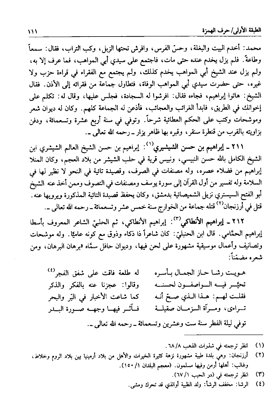 212 - إبراهيم الأنطاكي: إبراهيم الأنطاكي، ثم الحلبي الشاعر المعروف بأسطا إبراهيم الحمامي. قال ابن الحنبلي: كان شاعراً ذا ذكاء وذوق مع كونه عامياً. وله موشحات وتصانيف وأعمال موسيقية مشهورة على لحن فيها، وديوان حافل سماه " برهان البرهان "، ومن شعره مضمناً: