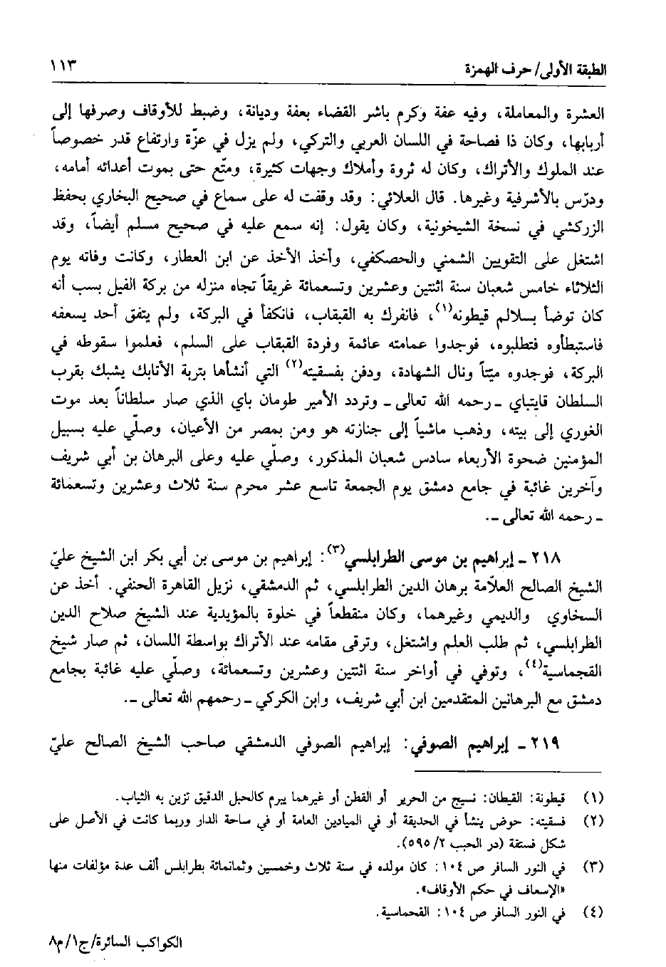 218 - إبراهيم بن موسى الطرابلسي: إبراهيم بن موسى بن أبي بكر ابن الشيخ علي الشيخ الصالح العلامة برهان الدين الطرابلسي، ثم الدمشقي. نزيل القاهرة الحنفي. أخذ عن السخاوي والديمي وغيرهما، وكان منقطعاً في خلوة بالمؤيدية عند الشيخ صلاح الدين الطرابلسي، ثم طلب العلم واشتغل، وترقى مقامه عند الأتراك بواسطة اللسان، ثم صار شيخ القجماسية، وتوفي في أواخر سنة اثنتين وعشرين وتسعمائة، وصلي عليه غائبة بجامع دمشق مع البرهانين المتقدمين ابن أبي شريف، وابن الكركي - رحمهم الله تعالى -.