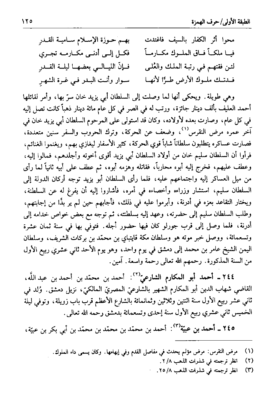 244 - أحمد أبو المكارم الشارعي: أحمد بن محمد بن أحمد بن عبد الله، القاضي شهاب الدين أبو المكارم الشهير بالشارعي المصري المالكي، نزيل دمشق. ولد في ثاني عشر ربيع الأول سنة اثنتين وثلاثين وثمانمائة بالشارع الأعظم قرب باب زويلة، وتوفي ليلة الخميس ثاني عشري ربيع الأول سنة إحدى وتسعمائة بدمشق رحمه الله تعالى.