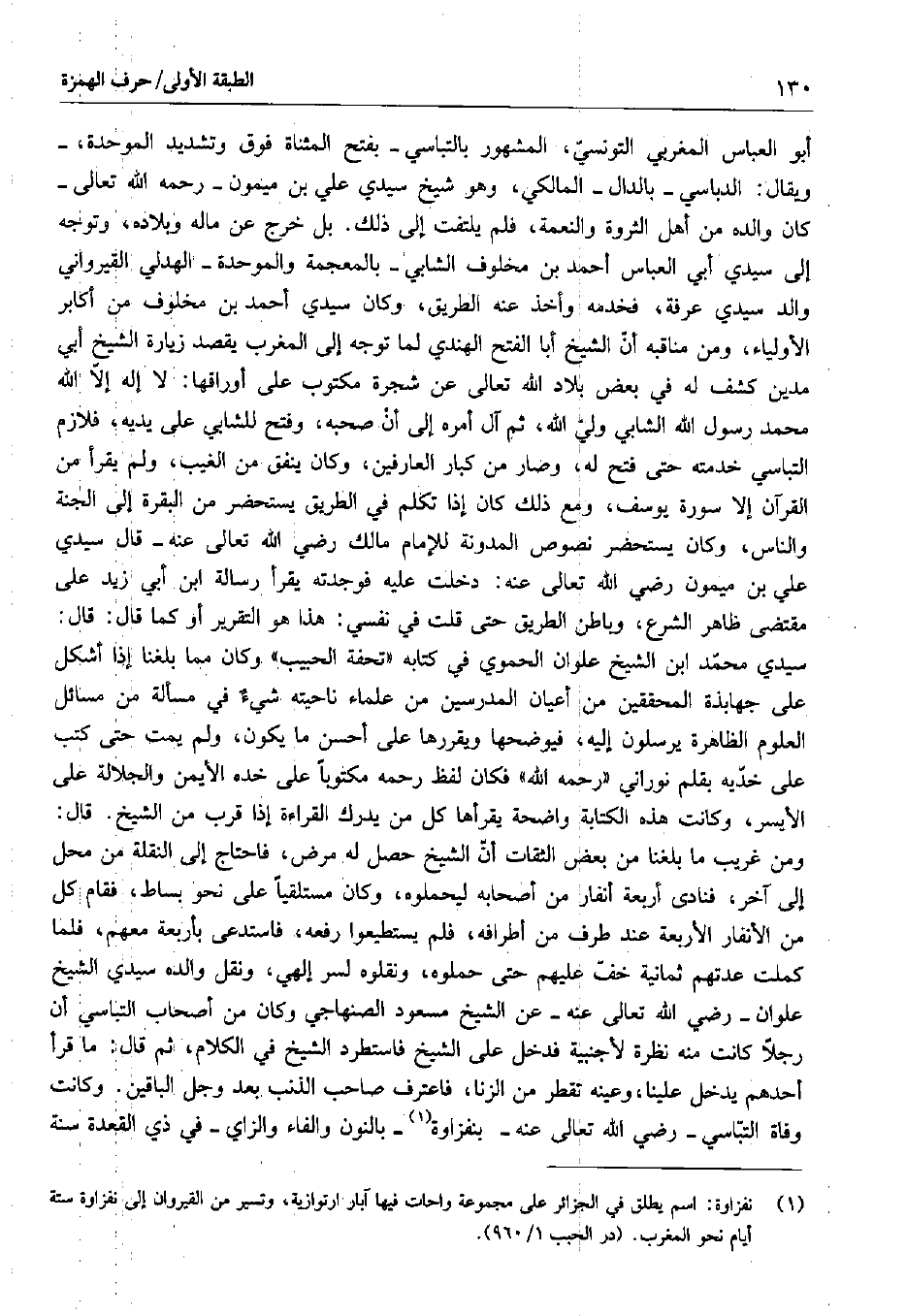 أبو العباس المغربي التونسي، المشهور بالتباسي - بفتح المثناة فوق وتشديد الموحدة، - ويقال: الدباسي - بالدال - المالكي، وهو شيخ سيدي علي بن ميمون - رحمه الله تعالى - كان والده من أهل الثروة والنعمة، فلم يلتفت إلى ذلك. بل خرج عن ماله وبلاده، وتوجه إلى سيدي أبي العباس أحمد بن مخلوف الشابي - بالمعجمة والموحدة - الهدلي القيرواني والد سيدي عرفة، فخدمه وأخذ عنه الطريق، وكان سيدي أحمد بن مخلوف من أكابر الأولياء، ومن مناقبه أن الشيخ أبا الفتح الهندي لما توجه إلى المغرب يقصد زيارة الشيخ أبي مدين كشف له في بعض بلاد الله تعالى عن شجرة مكتوب على أوراقها: لا إله إلا الله محمد رسول الله الشابي ولي الله، ثم آل أمره إلى أن صحبه، وفتح للشابي على يديه، فلازم التباسي خدمته حتى فتح له، وصار من كبار العارفين، وكان ينفق من الغيب، ولم يقرأ من القرآن إلا سورة يوسف، ومع ذلك كان إذا تكلم في الطريق يستحضر من البقرة إلى الجنة والناس، وكان يستحضر نصوص المدونة للإمام مالك رضي الله تعالى عنه - قال سيدي علي بن ميمون رضي الله تعالى عنه: دخلت عليه فوجدته يقرأ رسالة ابن أبي زيد على مقتضى ظاهر الشرع، وباطن الطريق حتى قلت في نفسي: هذا هو التقرير أو كما قال: قال: سيدي محمد ابن الشيخ علوان الحموي في كتابه " تحفة الحبيب " وكان مما بلغنا إذا أشكل على جهابذة المحققين من أعيان المدرسين من علماء ناحيته شيء في مسألة من مسائل العلوم الظاهرة يرسلون إليه، فيوضحها ويقررها على أحسن ما يكون، ولم يمت حتى كتب على خديه بقلم نوراني " رحمه الله " فكان لفظ رحمه مكتوباً على خده الأيمن والجلالة على الأيسر، وكانت هذه الكتابة واضحة يقرأها كل من يدرك القراءة إذا قرب من الشيخ. قال: ومن غريب ما بلغنا من بعض الثقات أن الشيخ حصل له مرض، فاحتاج إلى النقلة من محل إلى آخر، فنادى أربعة أنفار من أصحابه ليحملوه، وكان مستلقياً على نحو بساط، فقام كل من الأنفار الأربعة عند طرف من أطرافه، فلم يستطيعوا رفعه، فاستدعى بأربعة معهم، فلما كملت عدتهم ثمانية خف عليهم حتى حملوه، ونقلوه لسر إلهي، ونقل والده سيدي الشيخ علوان - رضي الله تعالى عنه - عن الشيخ مسعود الصنهاجي وكان من أصحاب التباسي أن رجلاً كانت منه نظرة لأجنبية فدخل على الشيخ فاستطرد الشيخ في الكلام، ثم قال: ما قرأ أحدهم يدخل علينا، وعينه تقطر من الزنا، فاعترف صاحب الذنب بعد وجل الباقين. وكانت وفاة التباسي - رضي الله تعالى عنه - بنفزاوة - بالنون والفاء والزاي - في ذي القعدة سنة