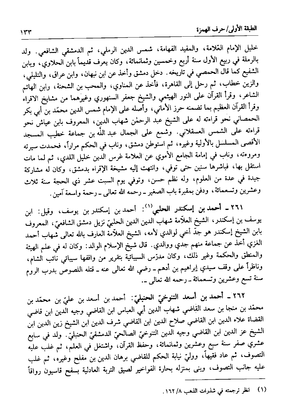 261 - أحمد بن إسكندر الحلبي: أحمد بن إسكندر بن يوسف، وقيل: ابن يوسف بن إسكندر، الشيخ العلامة شهاب الدين الدين الحلبي نزيل دمشق الشافعي، المعروف بابن الشيخ إسكندر هو جد أخي لوالدي لأمه، الشيخ العلامة العارف بالله تعالى شهاب أحمد الغزي أخذ عن جماعة منهم جدي ووالدي. قال شيخ الإسلام الوالد: وكان له في علم الهيئة والمنطق والحكمة وغير ذلك، وكان مدرس السيبائية بتقرير من واقفها سيبائي نائب الشام، وناظراً على وقف سيدي إبراهيم بن أدهم - رضي الله تعالى عنه - قتله اللصوص بدرب الروم سنة تسع وعشرين وتسعمائة - رحمه الله تعالى -.