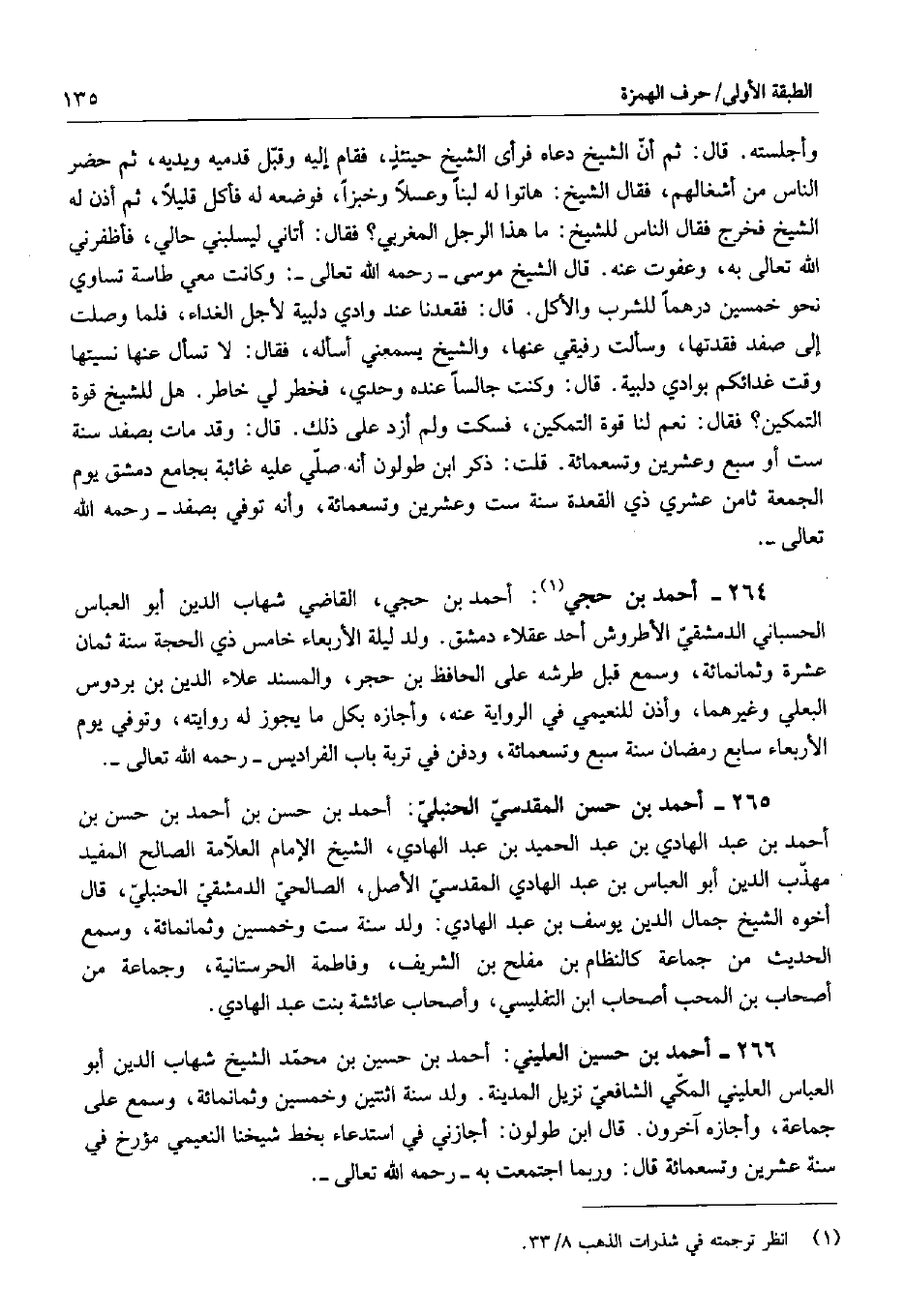 264 - أحمد بن حجي: أحمد بن حجي، القاضي شهاب الدين أبو العباس الحسباني الدمشقي الأطروش أحد عقلاء دمشق. ولد ليلة الأربعاء خامس ذي الحجة سنة ثمان عشرة وثمانمائة، وسمع قبل طرشه على الحافظ بن حجر، والمسند علاء الدين بن بردوس البعلي وغيرهما، وأذن للنعيمي في الرواية عنه، وأجازه بكل ما يجوز له روايته، وتوفي يوم الأربعاء سابع رمضان سنة سبع وتسعمائة، ودفن في تربة باب الفراديس - رحمه الله تعالى -.