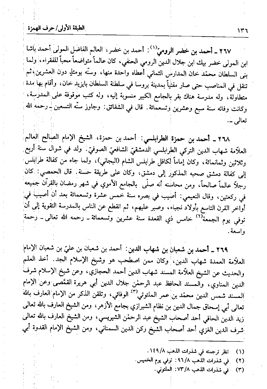 268 - أحمد بن حمزة الطرابلسي: أحمد بن حمزة، الشيخ الإمام الصالح العالم العلامة شهاب الدين التركي الطرابلسي الدمشقي الشافعي الصوفي. ولد في شوال سنة أربع وثلاثين وثمانمائة، وكان إماماً لكافل طرابلس الشام " البجاني "، ولما جاء من كفالة طرابلس إلى كفالة دمشق صحبه المذكور إلى دمشق، وكان على طريقة حسنة. قال الحمصي: كان رجلاً عالماً صالحاً، ومن محاسنه أنه صلى بالجامع الأموي في شهر رمضان بالقرآن جميعه في ركعتين، وقال النعيمي: أصيب في بصره سنة خمس عشرة وتسعمائة بعد أن أصيب في أواخر القرن التاسع بأولاد نجباء، وصبر عليهم، ثم انقطع عن الناس بالمدرسة التقوية إلى أن توفي يوم الجمعة خامس ذي القعدة سنة عشرين وتسعمائة - رحمه الله تعالى - رحمة واسعة.