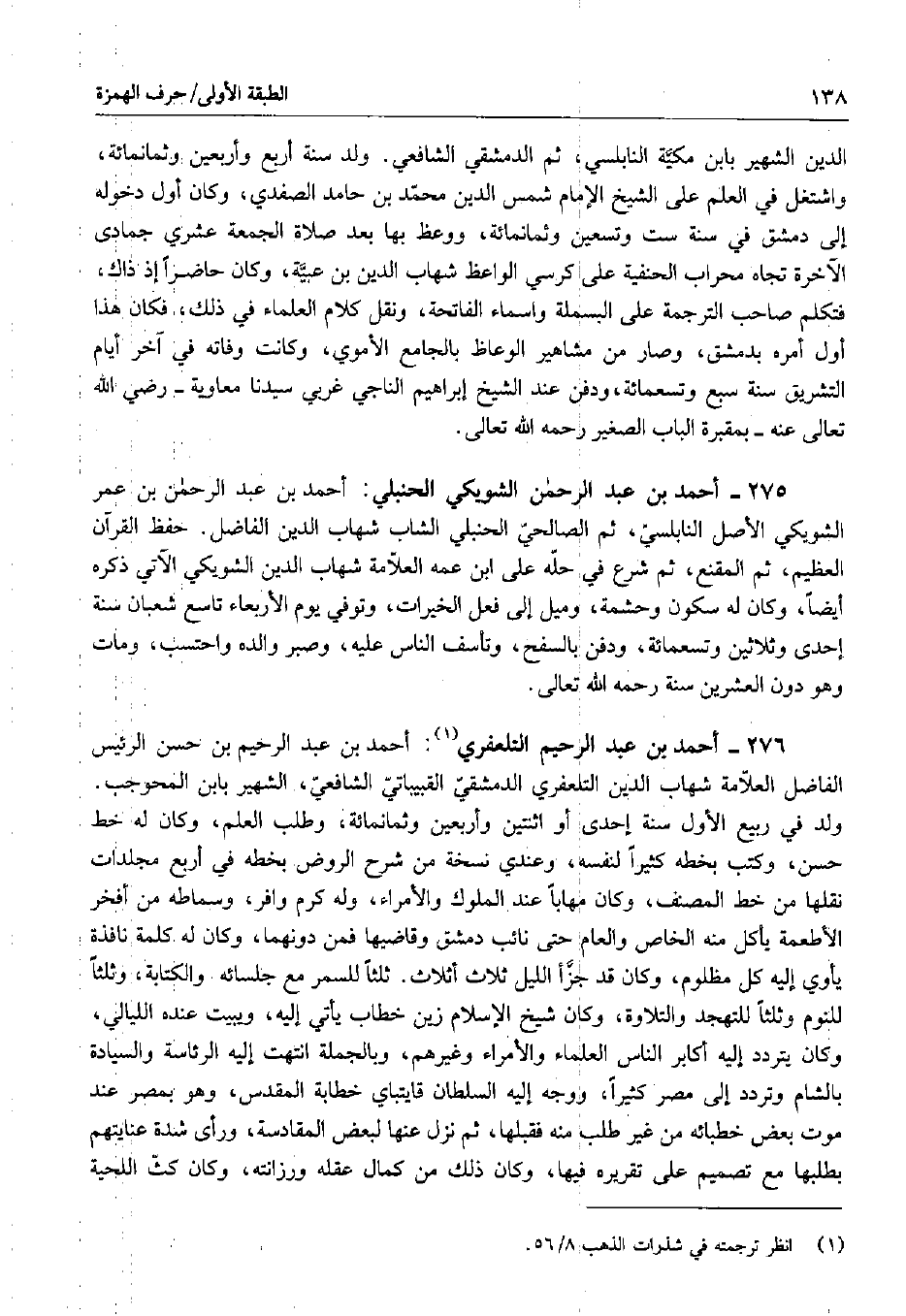 276 - أحمد بن عبد الرحيم التلعفري: أحمد بن عبد الرحيم بن حسن الرئيس الفاضل العلامة شهاب الدين التلعفري الدمشقى القبيباتي الشافعي، الشهير بابن المحوجب. ولد في ربيع الأول سنة إحدى أو اثنتين وأربعين وثمانمائة، وطلب العلم، وكان له خط حسن، وكتب بخطه كثيراً لنفسه، وعندي نسخة من شرح الروض بخطه في أربع مجلدات نقلها من خط المصنف، وكان مهاباً عند الملوك والأمراء، وله كرم وافر، وسماطه من أفخر الأطعمة يأكل منه الخاص والعام حتى نائب دمشق وقاضيها فمن دونهما، وكان له كلمة نافذة يأوي إليه كل مظلوم، وكان قد جزأ الليل ثلاث أثلاث. ثلثاً للسمر مع جلسائه والكتابة، وثلثاً للنوم وثلثاً للتهجد والتلاوة، وكان شيخ الإسلام زين خطاب يأتي إليه، ويبيت عنده الليالي، وكان يتردد إليه أكابر الناس العلماء والأمراء وغيرهم، وبالجملة انتهت إليه الرئاسة والسيادة بالشام وتردد إلى مصر كثيراً، ووجه إليه السلطان قايتباي خطابة المقدس، وهو بمصر عند موت بعض خطبائه من غير طلب منه فقبلها، ثم نزل عنها لبعض المقادسة، ورأى شدة عنايتهم بطلبها مع تصميم على تقريره فيها، وكان ذلك من كمال عقله ورزانته، وكان كث اللحية