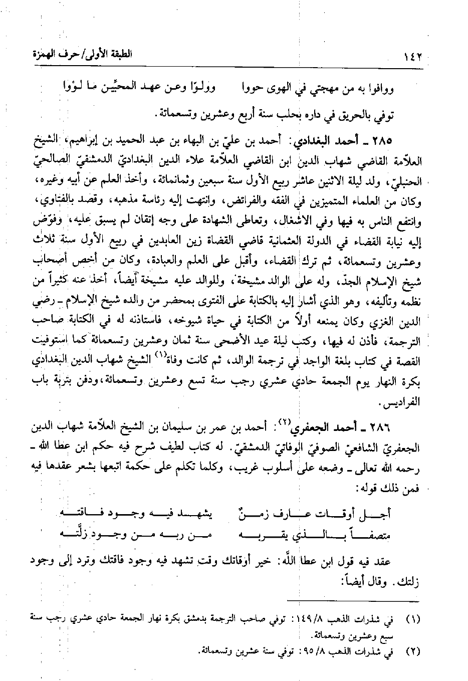 285 - أحمد البغدادي: أحمد بن علي بن البهاء بن عبد الحميد بن إبراهيم، الشيخ العلامة القاضي شهاب الدين ابن القاضي العلامة علاء الدين البغدادي الدمشقي الصالحي الحنبلي، ولد ليلة الاثنين عاشر ربيع الأول سنة سبعين وثمانمائة، وأخذ العلم عن أبيه وغيره، وكان من العلماء المتميزين في الفقه والفرائض، وانتهت إليه رئاسة مذهبه، وقصد بالفتاوي، وانتفع الناس به فيها وفي الاشغال، وتعاطى الشهادة على وجه إتقان لم يسبق عليه، وفوض إليه نيابة القضاء في الدولة العثمانية قاضي القضاة زين العابدين في ربيع الأول سنة ثلاث وعشرين وتسعمائة، ثم ترك القضاء، وأقبل على العلم والعبادة، وكان من أخص أصحاب شيخ الإسلام الجد، وله على الوالد مشيخة، وللوالد عليه مشيخة أيضاً، أخذ عنه كثيراً من نظمه وتأليفه، وهو الذي أشار إليه بالكتابة على الفتوى بمحضر من والده شيخ الإسلام - رضي الدين الغزي وكان يمنعه أولا من الكتابة في حياة شيوخه، فاستأذنه له في الكتابة صاحب الترجمة، فأذن له فيها، وكتب ليلة عيد الأضحى سنة ثمان وعشرين وتسعمائة كما استوفيت القصة في كتاب بلغة الواجد في ترجمة الوالد، ثم كانت وفاة الشيخ شهاب الدين البغدادي بكرة النهار يوم الجمعة حادي عشري رجب سنة تسع وعشرين وتسعمائة، ودفن بتربة باب الفراديس.286 - أحمد الجعفري: أحمد بن عمر بن سليمان بن الشيخ العلامة شهاب الدين الجعفري الشافع الصوفي الوفائي الدمشقي. له كتاب لطيف شرح فيه حكم ابن عطا آلله - رحمه الله تعالى - وضعه على أسلوب غريب، وكلما تكلم على حكمة اتبعها بشعر عقدها فيه فمن ذلك قوله: