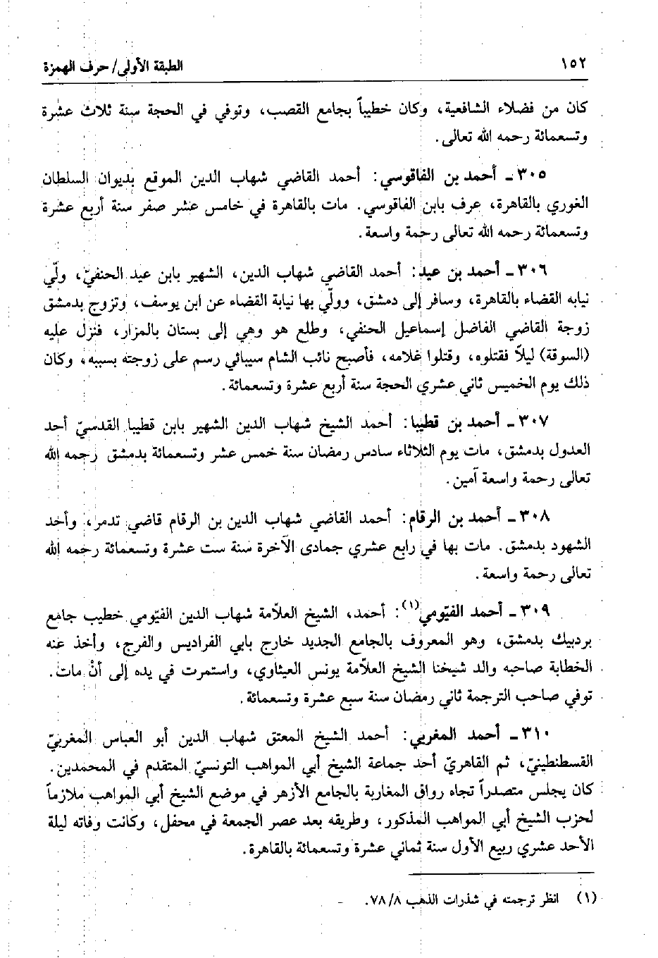 309 - أحمد الفيومي: أحمد، الشيخ العلامة شهاب الدين الفيومي خطيب جامع برد بيك بدمشق، وهو المعروف بالجامع الجديد خارج بابي الفراديس والفرج، وأخذ عنه الخطابة صاحبه والد شيخنا الشيخ العلامة يونس العيثاوي، واستمرت في يده إلى أن مات. توفي صاحب الترجمة ثاني رمضان سنة سبع عشرة وتسعمائة.