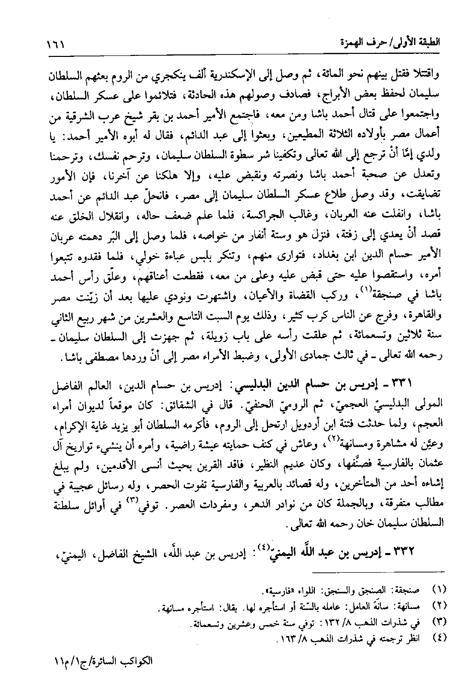 331 - إدريس بن حسام الدين البدليسي: إدريس بن حسام الدين، العالم الفاضل المولى البدليسي العجمي، ثم الرومي الحنفي. قال في الشقائق: كان موقعاً لديوان أمراء العجم، ولما حدثت فتنة ابن أردويل ارتحل إلى الروم، فأكرمه السلطان أبو يزيد غاية الإكرام، وعين له مشاهرة ومسانهة، وعاش في كنف حمايته عيشة راضية، وأمره أن ينشيء تواريخ آل عثمان بالفارسية فصنفها، وكان عديم النظير، فاقد القرين بحيث أنسى الأقدمين، ولم يبلغ إشاءه أحد من المتأخرين، وله قصائد بالعربية والفارسية تفوت الحصر، وله رسائل عجيبة في مطالب متفرقة، وبالجملة كان من نوادر الدهر، ومفردات العصر. توفي في أوائل سلطنة السلطان سليمان خان رحمه الله تعالى.