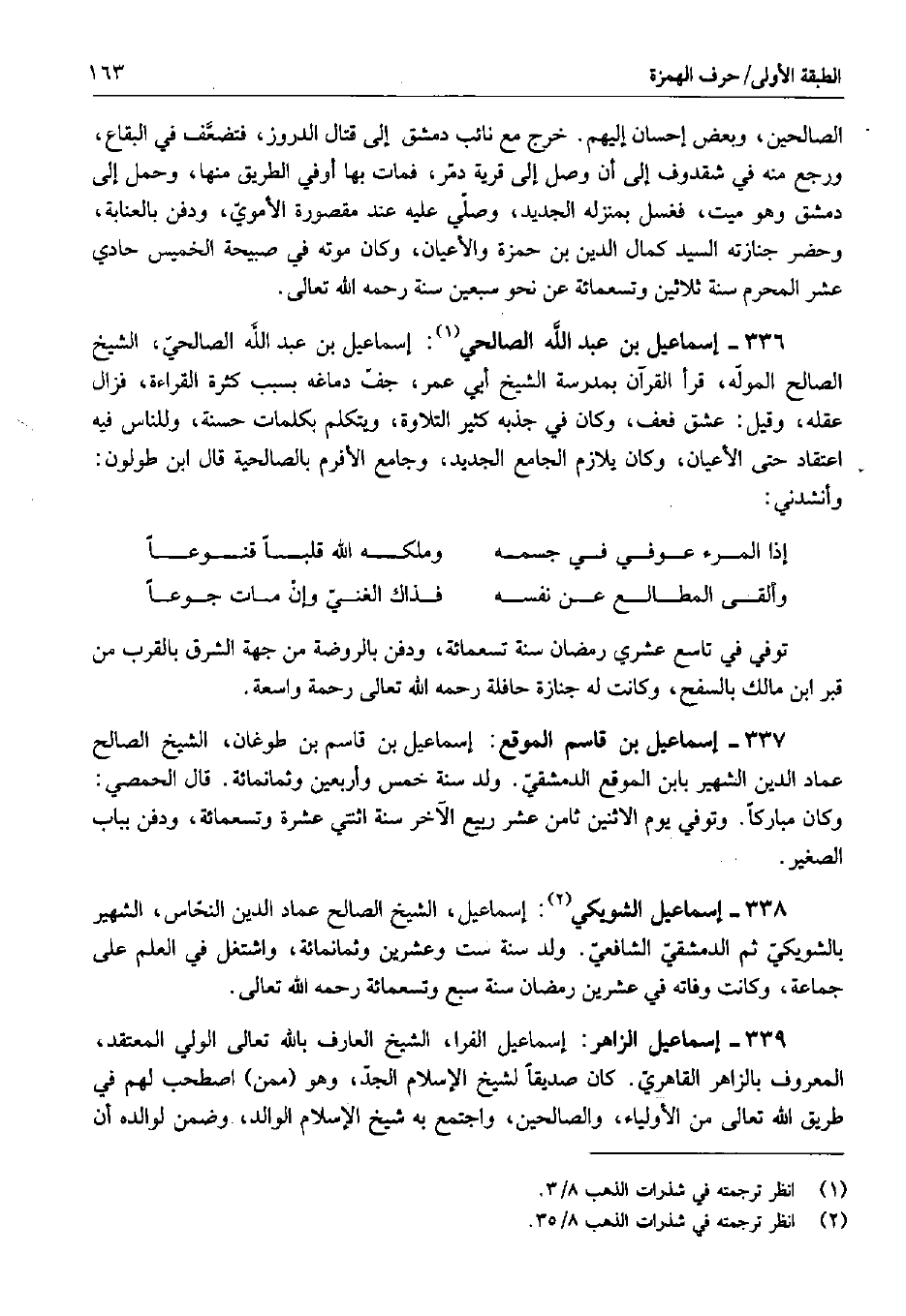 338 - إسماعيل الشويكي: إسماعيل، الشيخ الصالح عماد الدين النحاس، الشهير بالشويكي ثم الدمشقي الشافعي. ولد سنة ست وعشرين وثمانمائة، واشغل في العلم على جماعة، وكانت وفاته في عشرين رمضان سنة سبع وتسعمائة رحمه الله تعالى.