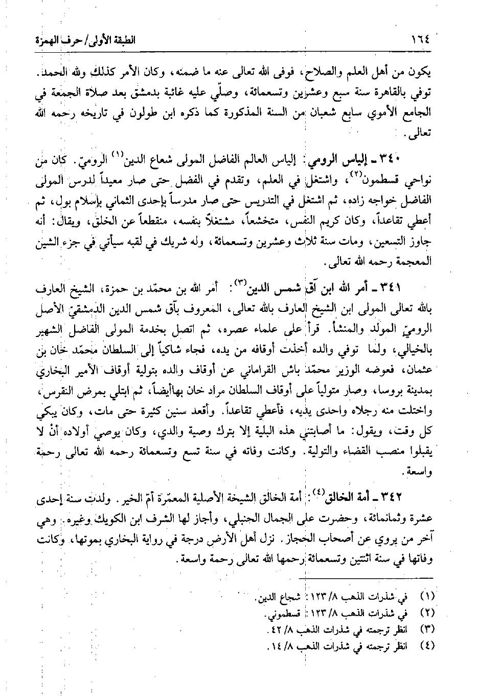 341 - أمر الله ابن آق شمس الدين: أمر الله بن محمد بن حمزة، الشيخ العارف بالله تعالى المولى ابن الشيخ العارف بالله تعالى، المعروف بآق شمس الدين الدمشقي الأصل الرومي المولد والمنشأ. قرأ على علماء عصره، ثم اتصل بخدمة المولى الفاضل الشهير بالخيالي، ولما توفي والده أخذت أوقافه من يده، فجاء شاكياً إلى السلطان محمد خان بن عثمان، فعوضه الوزير محمد باش القراماني عن أوقاف والده بتولية أوقاف الأمير البخاري بمدينة بروسا، وصار متولياً على أوقاف السلطان مراد خان بها أيضاً، ثم ابتلي بمرض النقرس، واختلت منه رجلاه واحدى يديه، فأعطي تقاعداً. وأقعد سنين كثيرة حتى مات، وكان يبكي كل وقت، ويقول: ما أصابتني هذه البلية إلا بترك وصية والدي، وكان يوصي أولاده أن لا يقبلوا منصب القضاء والتولية. وكانت وفاته في سنة تسع وتسعمائة رحمه الله تعالى رحمةً واسعةً.