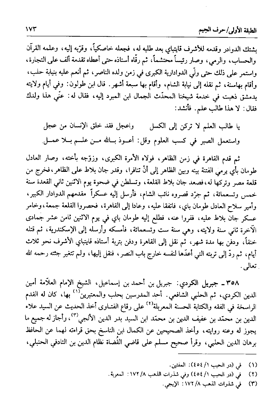 358 - جبريل الكردي: جبريل بن أحمد بن إسماعيل، الشيخ الإمام العلامة أمين الدين الكردي، ثم الحلبي الشافعي. أحد المدرسين بحلب والمعتبرين بها، كان له القدم الراسخة في الفقه والكتابة الحسنة المعربلة على رقاع الفتاوى أخذ الحديث عن السيد علاء الدين بن محمد بن عفيف الدين بن محمد ابن السيد بدر الدين الألجي، وأجاز له جميع ما يجوز له وعنه روايته، وأخذ الصحيحين عن الكمال ابن الناسخ بحق قراءته لهما عن الحافظ برهان الدين الحلبي، وقرأ صحيح مسلم على قاضي القضاة نظام الدين بن التادفي الحنبلي،
