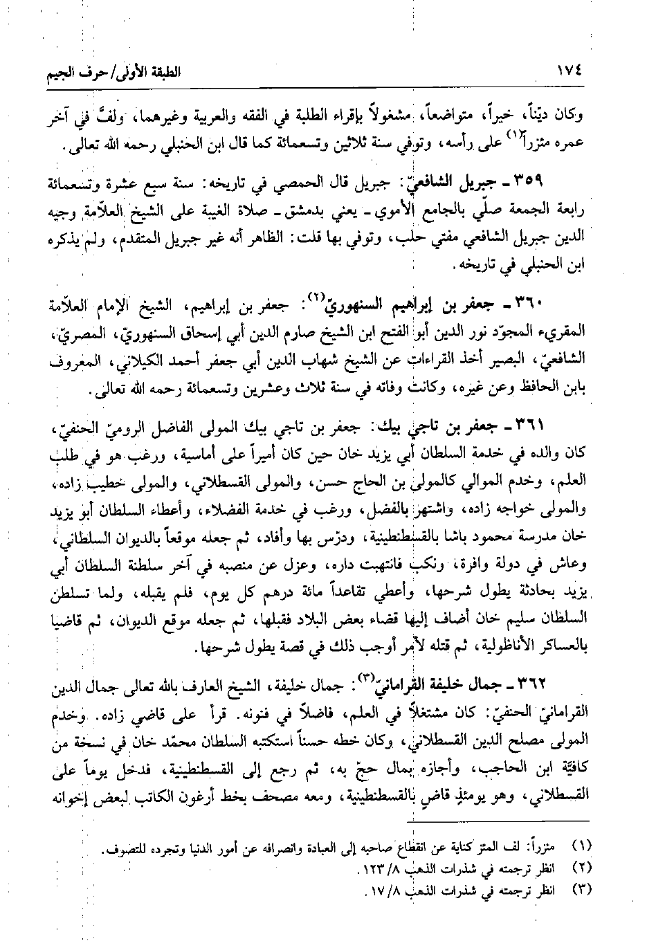 361 - جعفر بن تاجي بيك: جعفر بن تاجي بيك المولى الفاضل الرومي الحنفي، كان والده في خدمة السلطان أبي يزيد خان حين كان أميراً على أماسية، ورغب هو في طلب العلم، وخدم الموالي كالمولى بن الحاج حسن، والمولى القسطلاني، والمولى خطيب زده، والمولى خواجه زاده، واشتهر بالفضل، ورغب في خدمة الفضلاء، وأعطاء السلطان أبو يزيد خان مدرسة محمود باشا بالقسطنطينية، ودرس بها وأفاد، ثم جعله موقعاً بالديوان السلطاني، وعاش في دولة وافرة، ونكب فانتهبت ثاره، وعزل عن منصبه في آخر سلطنة السلطان أبي يزيد بحادثة يطول شرحها، وأعطي تقاعداً مائة درهم كل يوم، فلم يقبله، ولما تسلطن السلطان سليم خان أضاف إليها قضاء بعض البلاد فقبلها، ثم جعله موقع الديوان، ثم قاضياً بالعساكر الأناظولية، ثم قتله لأمر أوجب ذلك في قصة يطول شرحها.