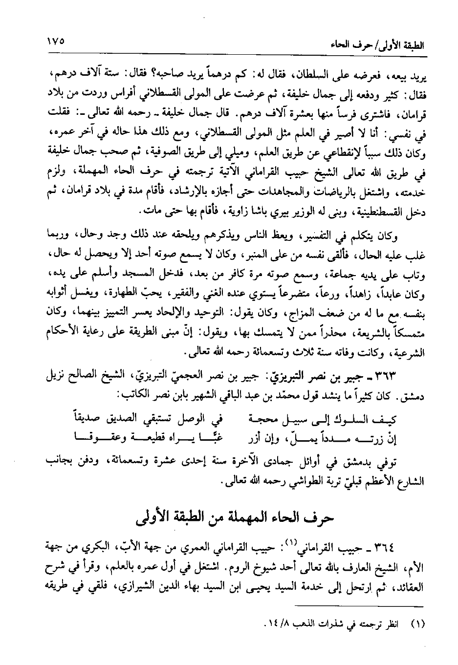 من الطبقة الأولى: 364 - حبيب القراماني: حبيب القراماني العمري من جهة الأب، البكري من جهة الأم، الشيخ العارف بالله تعالى أحد شيوخ الروم. اشتغل في أول عمره بالعلم، وقرأ في شرح العقائد، ثم ارتحل إلى خدمة السيد يحيى ابن السيد بهاء الدين الشيرازي، فلقي في طريقه