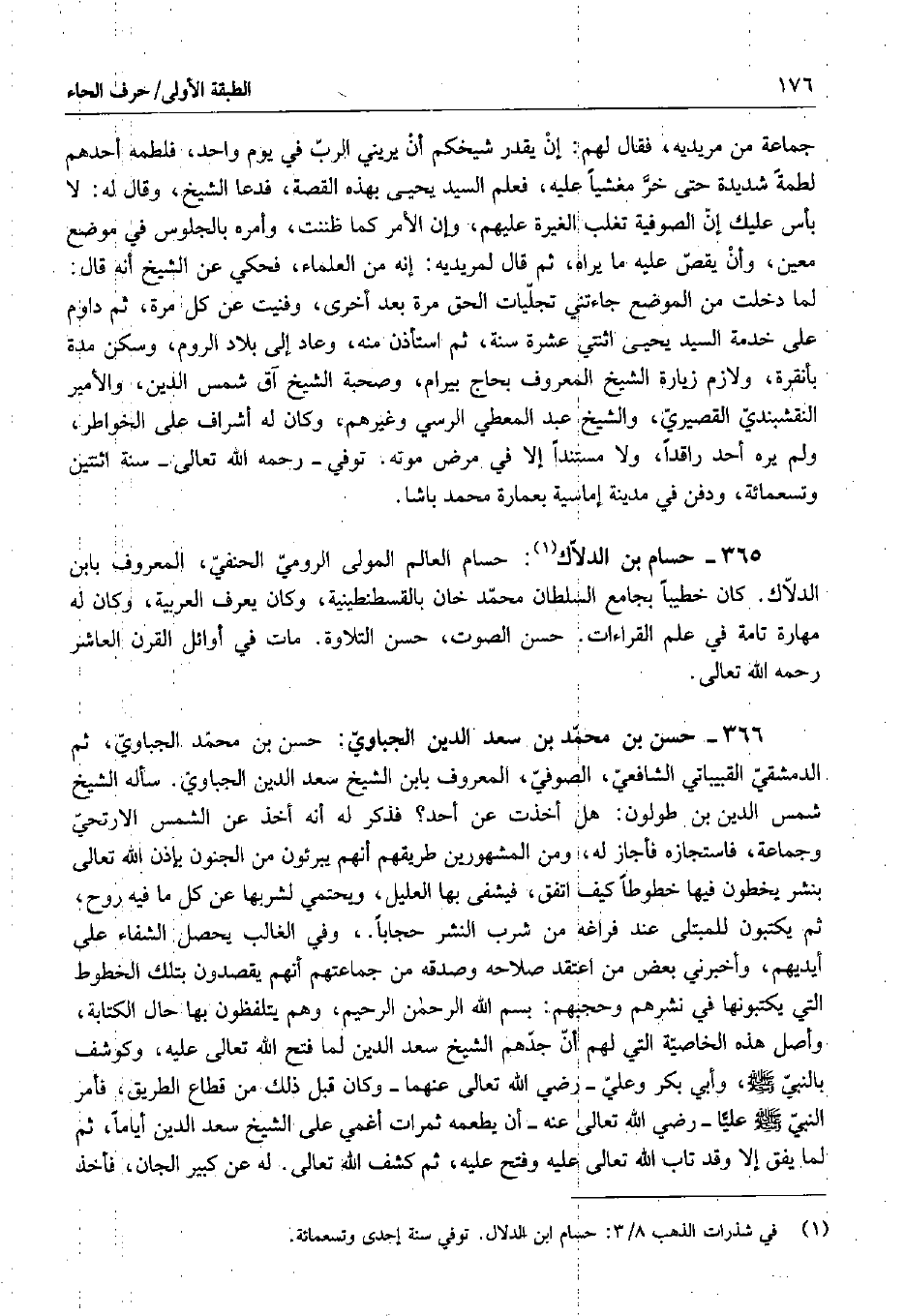365 - حسام بن الدلاك: حسام العالم المولى الرومي الحنفي، المعروف بابن الدلاك. كان خطيباً بجامع السلطان محمد خان بالقسطنطينية، وكان يعرف العربية، وكان له مهارة تامة في علم القراءات. حسن الصوت، حسن التلاوة. مات في أوائل القرن العاشر رحمه الله تعالى.