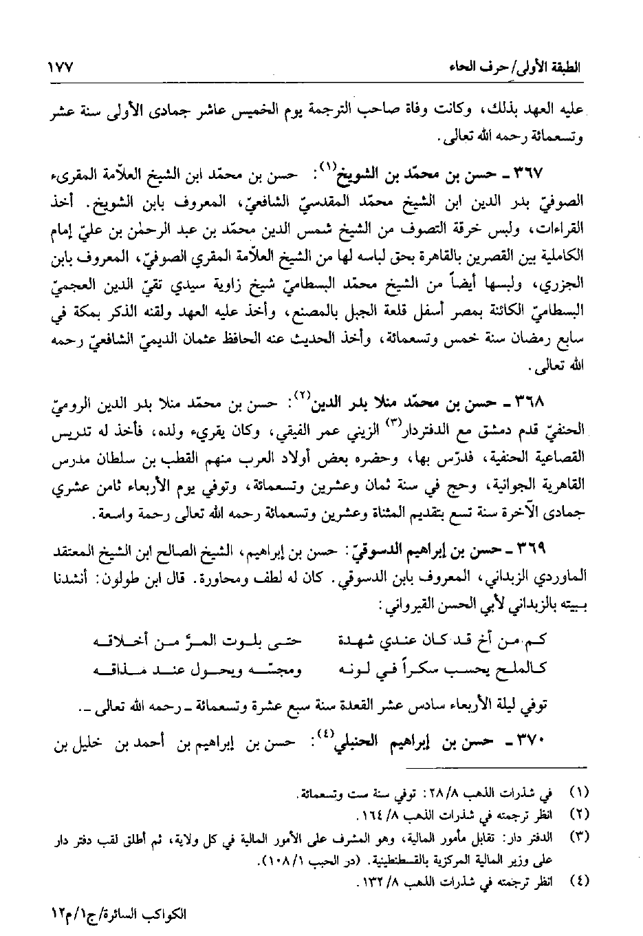 367 - حسن بن محمد بن الشويخ: حسن بن محمد ابن الشيخ العلامة المقرئ الصوفي بدر الدين ابن الشيخ محمد المقدسي الشافعي، المعروف بابن الشويخ. أخذ القراءات، ولبس خرقة التصوف من الشيخ شمس الدين محمد بن عبد الرحمن بن علي إمام الكاملية بين القصرين بالقاهرة بحق لباسه لها من الشيخ العلامة المقري الصوفي، المعروف بابن الجزري، ولبسها أيضاً من الشيخ محمد البسطامي شيخ زاوية سيدي تقي الدين العجمبم البسطامي الكائنة بمصر أسفل قلعة الجبل بالمصنع، وأخذ عليه العهد ولقنه الذكر بمكة في سابع رمضان سنة خمس وتسعمائة، وأخذ الحديث عنه الحافظ عثمان الديمي الشافعي رحمه الله تعالى.