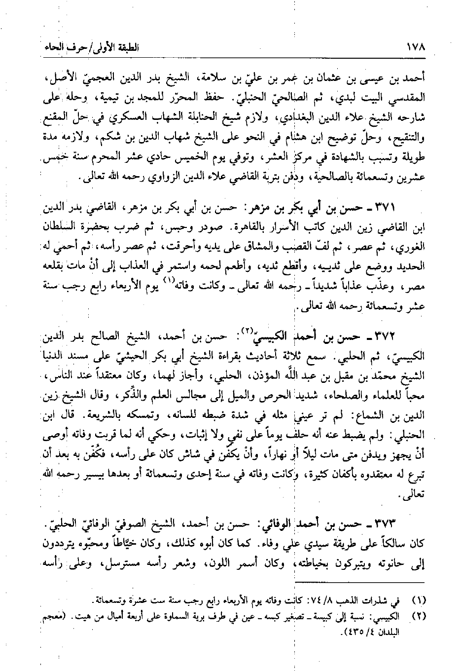 373 - حسن بن أحمد الوفائي: حسن بن أحمد، الشيخ الصوفي الوفائي الحلبي. كان سالكاً على طريقة سيدي علي وفاء. كما كان أبوه كذلك، وكان خياطاً ومحبوه يترددون إلى حانوته ويتبركون بخياطته، وكان أسمر اللون، وشعر رأسه مسترسل، وعلى رأسه