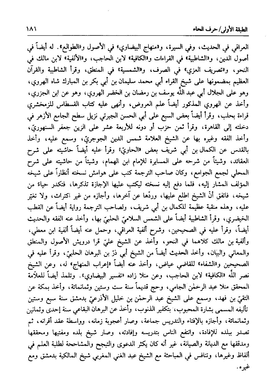 العراقي في الحديث، وفي السيرة، و " منهاج البيضاوي " في الأصول و " الطوالع ". له أيضاً في أصول الدين، و " الشاطبية " في القراءات و " الكافية " لابن الحاجب، و " الألفية " لابن ممالك في النحو، و " تصريف العزي " في الصرف، و " الشمسية " في المنطق، وقرأ الشاطبية والقرآن العظيم بمضمونها على شيخ القراء أبي محمد سليمان بن أبي بكر بن المبارك شاه الهروي، وهو على الجلال أبي عبد الله يوسف بن رمضان بن الخضر الهروي، وهو عن ابن الجزري، وأخذ عن الهروي المذكور أيضاً علم العروض، وأنهى عليه كتاب القسطاس للزمخشري قراءة بحلب، وقرأ أيضاً بعض السبع على أبي الحسن الجبرتي نزيل سطح الجامع الأزهر في دخلته إلى القاهرة، وقرأ ثمن حزب أو دونه للأربعة عشر على الزين جعفر السنهوري، وأخذ الفقه وغيره بها عن الشيخ العلامة شمس الدين الجوجري، وسمع عليه، وأخذ بالقدس عن الكمال بن أبي شريف بعض " الحاوي " وقرأ عليه أيضاً حاشيته على شرح العقائد، وشيئاً من شرحه على المسايرة للإمام ابن الهمام، وشيئاً من حاشيته على شرح المحلي لجمع الجوامع، وكان صاحب الترجمة كتب على هوامش نسخته أنظاراً على شيخه المؤلف المشار إليه، فلما دفع إليه نسخته ليكتب عليها الإجازة تذكرها، فتكدر حياءً من شيخه، فاتفق أن الشيخ اطلع عليها، وردها عن آخرها، وأجازه من غير اكتراث، ولا تغير عليه، وهذه منقبة عظيمة للكمال بن أبي شريف، ولصاحب الترجمة رواية أيضاً عن القطب الخيضري، وقرأ الشاطبية أيضاً على الشمس السلامي الحلبي بها، وأخذ عنه الفقه والحديث أيضاً، وقرأ عليه في الصحيحين، وشرح ألفية العراقي، وحمل عنه أيضاً ألفية ابن معطي، وألفية بن مالك كلاهما في النحو، وأخذ عن الشيخ علي قرا ثرويش الأصول والمنطق والمعاني والبيان، وأخذ الحديث أيضاً من الشيخ أبي ذز بن البرهان الحلبي، وقرأ عليه في الصحيحين و " الشفاء " للقاضي عياض، وأخذ عنه أيضاً " إعراب المنهاج " له، وعن الشيخ نصر الله " الكافية " لابن الحاجب، وعن منلا زاده " تفسير البيضاوي ". وتلمذ أيضاً للعلامة المحقق منلا عبد الرحمن الجامي، وحج قديماً سنة ست وستين وثمانمائة، وأخذ بمكة عن التقي بن فهد، وسمع على الشيخ عبد الرحمن بن خليل الأذرعي بدمشق سنة سبع وستين تأليفه المسمى بشارة المحبوب، بتكفير الذنوب، وأخذ عن البرهان البقاعي سنة إحدى وثمانين وثمانمائة، وأجازه بالإفتاء والتدريس جماعة، وصار أعجوبة زمانه، وواسطة عقد أقرانه، ثم تصدر ببلده للإفادة، وانتفع الناس بتدريسه وإفادته، وصار شيخ بلده ومفتيها ومحققها ومدققها مع الديانة والصيانة، غير أنه كان يكثر الدعوى والتبجح والمشاححة لطلبة العلم في ألفاظ وغيرها، وتنافس في المباحثة مع الشيخ عبد الغني المغربي شيخ المالكية بدمشق ومع غيره.