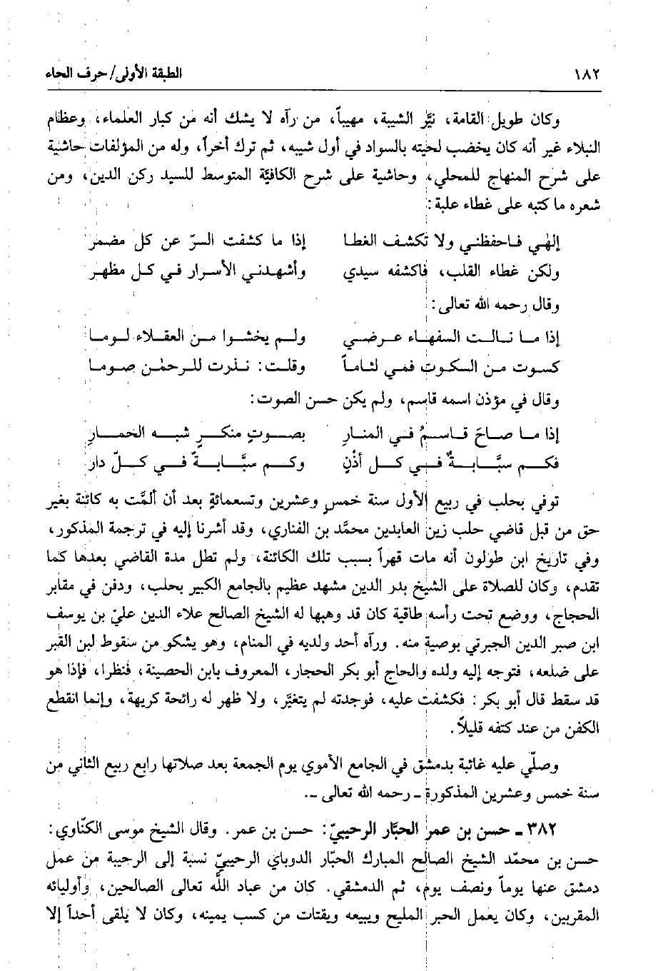 382 - حسن بن عمر الحبار الرحيبي: حسن بن عمر. وقال الشيخ موسى الكناوي: حسن بن محمد الشيخ الصالح المبارك الحبار الدوباي الرحيبي نسبة إلى الرحيبة من عمل دمشق عنها يوماً ونصف يوم، ثم الدمشقي. كان من عباد الله تعالى الصالدين، وأوليائه المقربين، وكان يعمل الحبر المليح ويبيعه ويقتات من كسب يمينه، وكان لا يلقى أحداً إلا