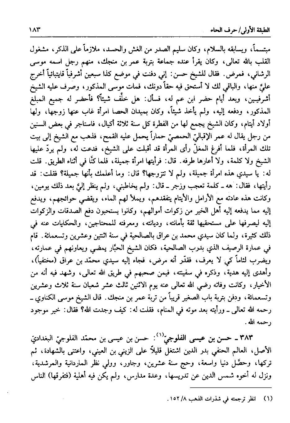 383 - حسن بن عيسى الفلوجي: حسن بن عيسى بن محمد الفلوجي البغدادي الأصل، العالم الحنفي بدر الدين اشتغل قليلاً على الزيني بن العيني، واعتنى بالشهادة، ثم تركها، وحضل دنيا واسعة، وحج سنة عشرين، وجاور، وولي نظر الماردانية والمرشدية، ونزل له أخوه شمس الدين عن تدريسها، وعدة مدارس، ولم يكن فيه أهلية فتفرقها الناس