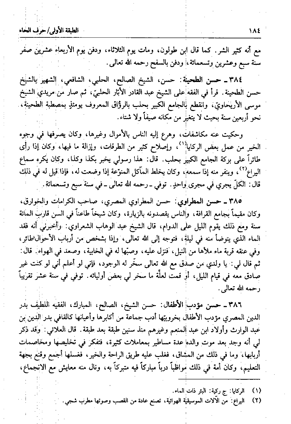 384 - حسن الطحينة: حسن، الشيخ الصالح، الحلبي، الشافعي، الشهير بالشيخ حسن الطحينة. قرأ في الفقه على الشيخ عبد القادر الأبار الحلبي، ثم صار من مريدي الشيخ موسى الأريحاوي، وانقطع بالجامع الكبير بحلب بالرواق المعروف يومئذ بمصطبة الطحينة، نحو أربعين سنة بحيث لا يتغير من مكانه صيفاً ولا شتاء.