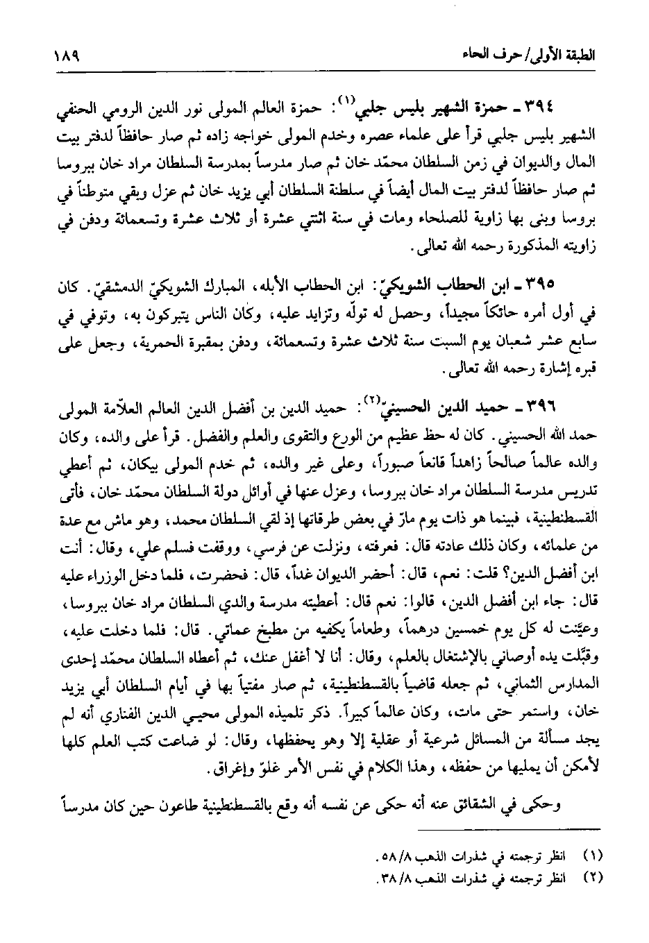 394 - حمزة الشهير بليس جلبي: حمزة العالم المولى نور الدين الرومي الحنفي الشهير بليس جلبي قرأ على علماء عصره وخدم المولى خواجه زاده ثم صار حافظاً لدفتر بيت المال والديوان في زمن السلطان محمد خان ثم صار مدرساً بمدرسة السلطان مراد خان ببروس ثم صار حافظاً لدفتر بيت المال أيضاً في سلطنة السلطان أبي يزيد خان ثم عزل وبقي متوطناً في بروسا وبنى بها زاوية للصلحاء ومات في سنة اثنتي عشرة أو ثلاث عشرة وتسعمائة ودفن في زاويته المذكورة رحمه الله تعالى.