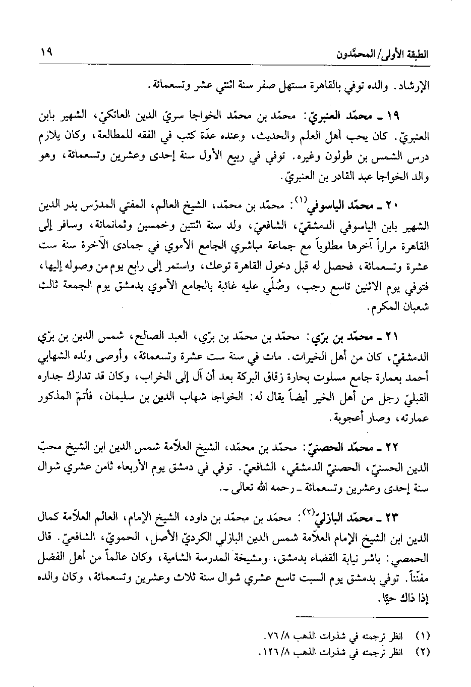 19 - محمد العنبري: محمد بن محمد الخواجا سري الدين العاتكي، الشهير بابن العنبري. كان يحب أهل العلم والحديث، وعنده عدة كتب في الفقه للمطالعة، وكان يلازم درس الشمس بن طولون وغيره. توفي في ربيع الأول سنة إحدى وعشرين وتسعمائة، وهو والد الخواجا عبد القادر بن العنبري.