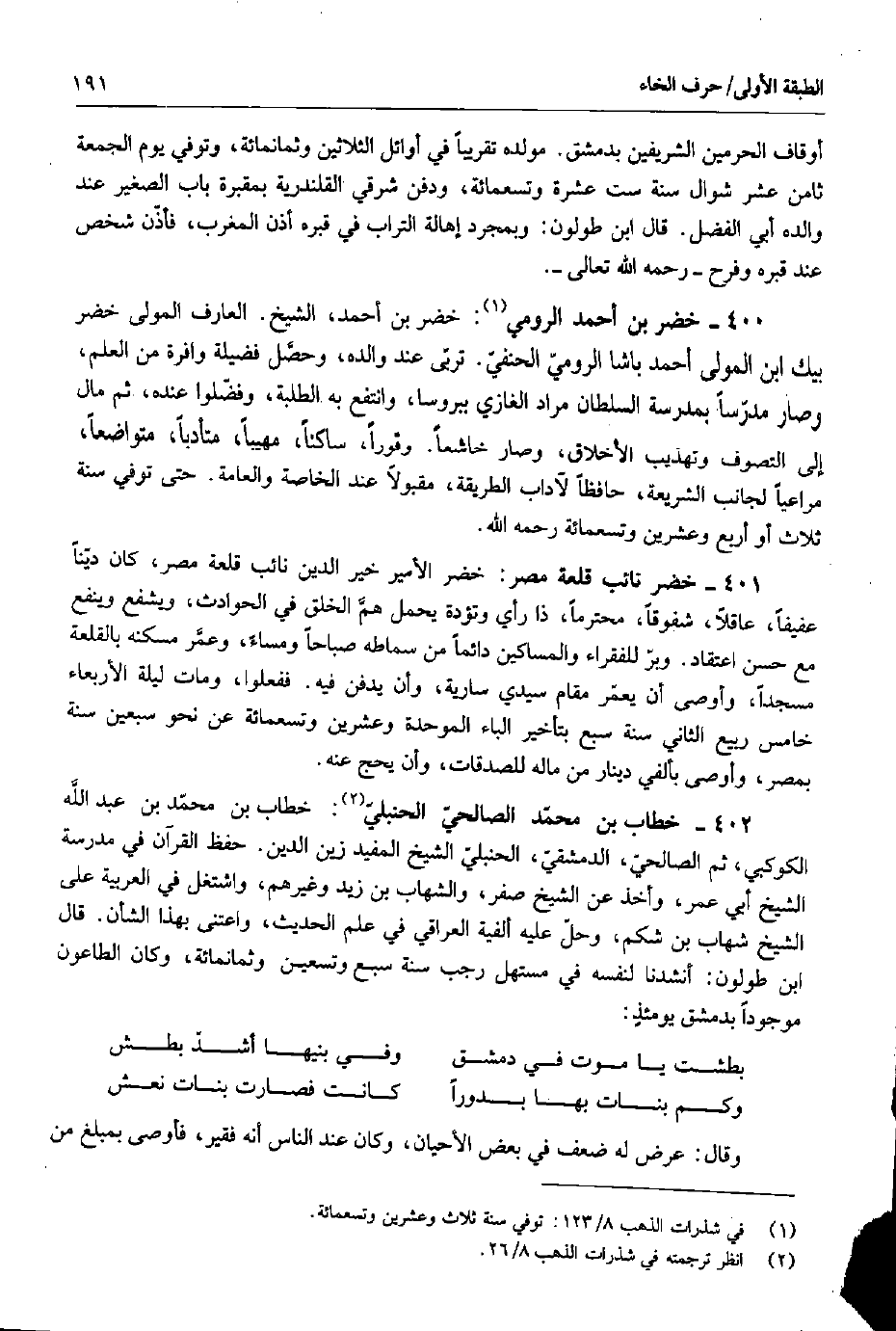 400 - خضر بن أحمد الرومي: خضر بن أحمد، الشيخ. العارف المولى خضر بيك ابن المولى أحمد باشا الرومي الحنفي. تربى عند والده، وحصل فضيلة وافرة من العلم وصار مدرساً بمدرسة السلطان مراد الغازي ببروسا، وانتفع به الطلبة، وفضلوا عنده، ثم مال إلى التصوف وتهذيب الأخلاق، وصار خاشعاً. وقوراً، ساكناً، مهيباً، متأدباً، متواضعاً مراعياً لجانب الشريعة، حافظاً لآداب الطريقة، مقبولاً عند الخاصة والعامة. حتى توفي سنة ثلاث أو أربع وعشرين وتسعمائة رحمه الله.