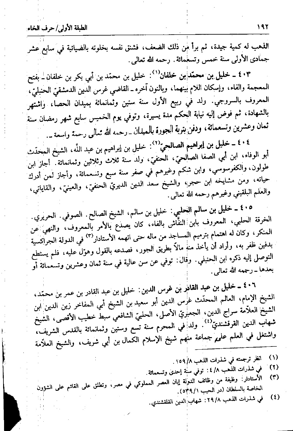 403 - خليل بن محمد بن خلفان: خليل بن محمد بن أبي بكر بن خلفان - بفتح المعجمة والفاء، وإسكان اللام بينهما، وبالنون آخره - القاضي غرس الدين الدمشقي الحنبلي، المعروف بالسروجي. ولد في ربيع الأول سنة ستين وثمانمائة بميدان الحصا، واشتهر بالشهادة، ثم فوض إليه نيابة الحكم مدة يسيرة، وتوفي يوم الخميس سابع شهر رمضان سنة ثمان وعشرين وتسعمائة، ودفن بتربة الجورة بالميدان - رحمه الله تعالى رحمة واسعة -.