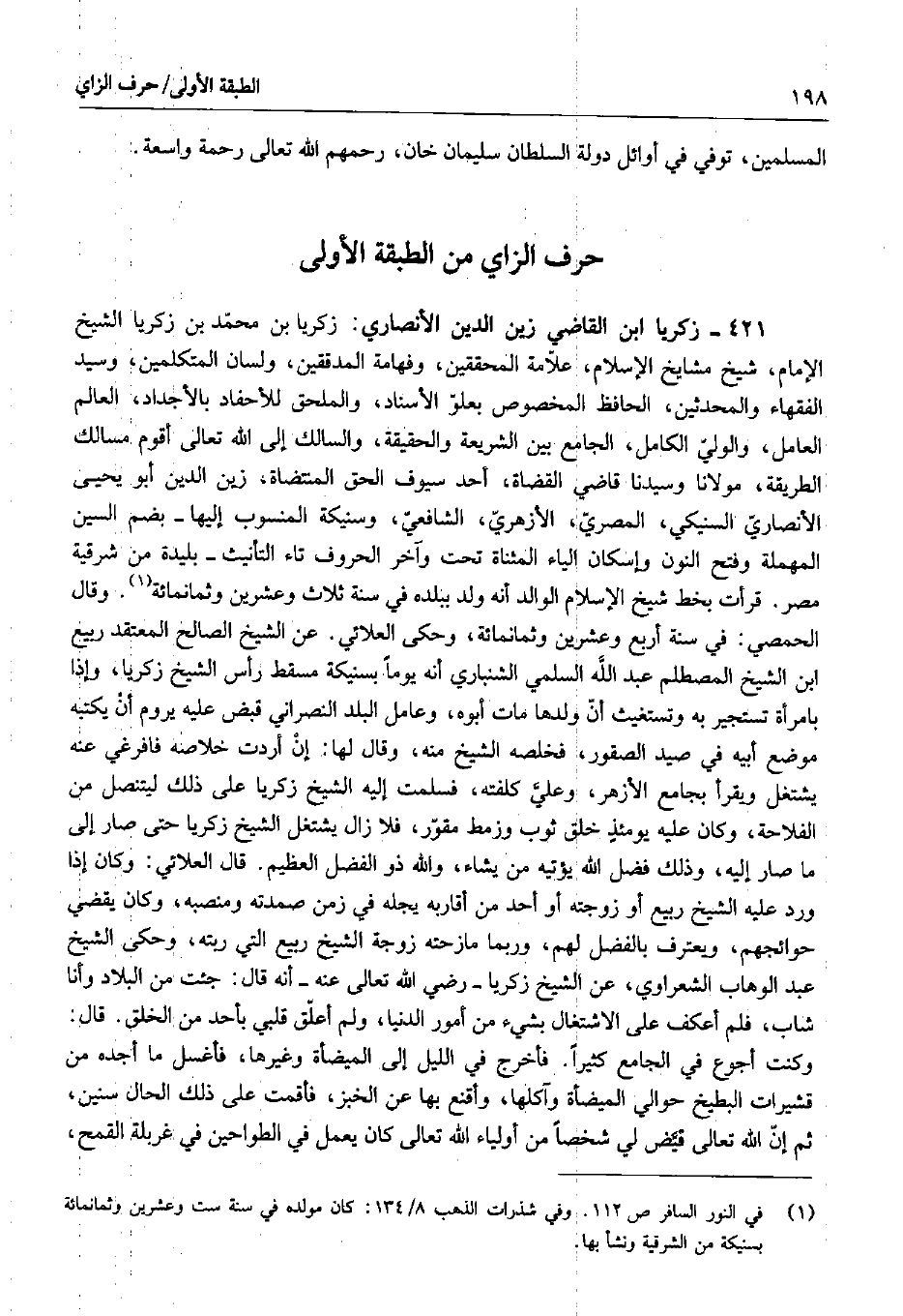 421 - زكريا ابن القاضي زين الدين الأنصاري: زكريا بن محمد بن زكريا الشيخ الإمام، شيخ مشايخ الإسلام، علامة المحققين، وفهامة المدققين، ولسان المتكلمين، وسيد الفقهاء والمحدثين، الحافظ المخصوص بعلو الأسناد، والملحق للأحفاد بالأجداد، العالم، العامل، والولي الكامل، الجامع بين الشريعة والحقيقة، والسالك إلى الله تعالى أقوم مسالك الطريقة، مولانا وسيدنا قاضي القضاة، أحد سيوف الحق المنتضاة، زين الدين أبو يحيى الأنصاري السنيكي، المصري، الأزهري، الشافعي، وسنيكة المنسوب إليها - بضم السين وفتح النون وإسكان الياء المثناة تحت وآخر الحروف تاء التأنيث - بليدة من شرقية مصر. قرأت بخط شيخ الإسلام الوالد أنه ولد ببلده في سنة ثلاث وعشرين وثمانمائة. وقال الحمصي: في سنة أربع وعشرين وثمانمائة، وحكى العلائي. عن الشيخ الصالح المعتقد ربيع ابن الشيخ المصطلم عبد الله السلمي الشنباري أنه يوماً بسنيكة مسقط رأس الشيخ زكريا، وإذا بامرأة تستجير به وتستغيث أن ولدها مات أبوه، وعامل البلد النصراني قبض عليه يروم أن يكتبه موضع أبيه في صيد الصقور، فخلصه الشيخ منه، وقال لها: إن أردت خلاصه فافرغي عنه يشتغل ويقرأ بجامع الأزهر، وعلي كلفته، فسلمت إليه الشيخ زكريا على ذلك ليتنصل من الفلاحة، وكان عليه يومئذ خلق ثوب وزمط مقور، فلا زال يشتغل الشيخ زكريا حتى صار إلى ما صار إليه، وذلك فضل الله يؤتيه من يشاء، والله ذو الفضل العظيم. قال العلائي: وكان إذا ورد عليه الشيخ ربيع أو زوجته أو أحد من أقاربه يجله في زمن صمدته ومنصبه، وكان يقضي حوائجهم، ويعترف بالفضل لهم، وربما مازحته زوجة الشيخ ربيع التي ربته، وحكى الشيخ عبد الوهاب الشعراوي، عن الشيخ زكريا - رضي الله تعالى عنه - أنه قال: جئت من البلاد وأنا شاب، فلم أعكف على الاشتغال بشيء من أمور الدنيا، ولم أعلق قلبي بأحد من الخلق. قال: وكنت أجوع في الجامع كثيراً. فأخرج في الليل إلى الميضأة وغيرها، فأغسل ما أجده من قشيرات البطيخ حوالي الميضأة وآكلها، وأقنع بها عن الخبز، فأقمت على ذلك الحال سنين، ثم إن الله تعالى قيض لي شخصاً من أولياء الله تعالى كان يعمل في الطواحين في غربلة القمح،