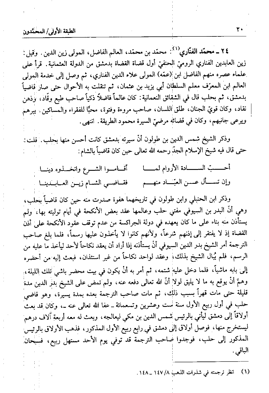 24 - محمد الفناري: محمد بن محمد، العالم الفاضل، المولى زين الدين. وقيل: زين العابدين الفناري الرومي الحنفي أول قضاة القضاة بدمشق من الدولة العثمانية. قرأ على علماء عصره منهم الفاضل ابن " عمه " المولى علاء الدين الفناري، ثم وصل إلى خدمة المولى العالم ابن المعرف معلم السلطان أبي يزيد بن عثمان، ثم تنقلت به الأحوال حتى صار قاضياً بدمشق، ثم بحلب قال في الشقائق النعمانية: كان عالماً فاضلاً ذكياً صاحب طبع وقاد، وذهن نقاد، وكان قوي الجنان، طلق اللسان، صاحب مروءة وفتوة، محباً للفقراء والمساكين. يبرهم ويرعى جانبهم، وكان في قضائه مرضي السيرة محمود الطريقة. انتهى.