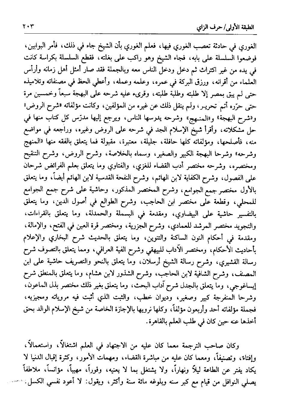 الغوري في حادثة تعصب الغوري فيها، فعلم الغوري بان الشيخ جاء في ذلك، فأمر البوابين، فوضعوا السلسلة على بابه، فجاء الشيخ وهو راكب على بغلته، فقطع السلسلة بكراسة كانت في يده من غير اكتراث ثم دخل ودخل الناس معه وبالجملة فقد صار أمثل أهل زمانه وأرأس العلماء من أقرانه، ورزق البركة في عمره، وعلمه وعمله، وأعطي الحظ في مصنفاته وتلاميذه حتى لم يبق بمصر إلا طلبته وطلبة طلبته، وقرئ عليه شرحه على البهجة سبعاً وخمسين مرة حتى حرره أتم تحرير، ولم ينقل ذلك عن غيره من المؤلفين، وكانت مؤلفاته " شرح الروض " و " شرح البهجة " و " المنهج " وشرحه يدرسها الناس، ويرجع إليها مدرس كل كتاب منها في حل مشكلاته، وأقرأ شيخ الإسلام الجد في شرحه على الروض وغيره، وراجعه في مواضع منه، فأصلحها، ومؤلفاته كلها حافلة، جليلة، معتبرة، مقبولة فما يتعلق بالفقه منها " المنهج وشرحه " وشرحا البهجة الكبير والصغير، وسماه بالخلاصة، وشرح الروض، وشرح التنقيح ومختصره، وشرحه مختصر أدب القضاء للغزي، والفتاوي وما يتعلق بعلم الفرائض شرحان على الفصول، وشرح الكفاية لابن الهائم، وشرح النفحة القدسية لابن الهائم أيضاً، وما يتعلق بالأول مختصر جمع الجوامع، وشرح المختصر المذكور، وحاشية على شرح جمع الجوامع للمحلي، وقطعة على مختصر ابن الحاجب، وشرح الطوالع في أصول الدين، وما يتعلق بالتفسير حاشية على البيضاوي، ومقدمة في البسملة والحمدلة، وما يتعلق بالقراءات، والتجويد مختصر المرشد للعمادي، وشرح الجزرية، ومختصر قرة العين في الفتح، والإمالة، ومقدمة في أحكام النون الساكنة والتنوين، وما يتعلق بالحديث شرح البخاري والإعلام بأحاديث الأحكام، ومختصر الآداب للبيهقي وشرح الفية العراقي، ومما يتعلق بالتصوف شرح رسالة القشيري، وشرح رسالة الشيخ أرسلان، وما يتعلق بالنحو والتصريف حاشية على ابن المصنف، وشرح الشافية لابن الحاجب، وشرح الشذور لابن هشام، وما يتعلق بالمنطق شرح إيساغوجي، وما يتعلق بالجدل شرح آداب البحث، وما يتعلق بغير ذلك مختصر بنل الماعون، وشرحا المنفرجة كبير وصغير، وديوان خطب، والثبت الذي أثبت فيه مروياته ومجيزيه، فجملة مؤلفاته أحد وأربعون مؤلفاً، وكلها نرويها بالإجازة الخاصة من شيخ الإسلام الوالد بحق أخذها عنه حين كان في طلب العلم بالقاهرة.