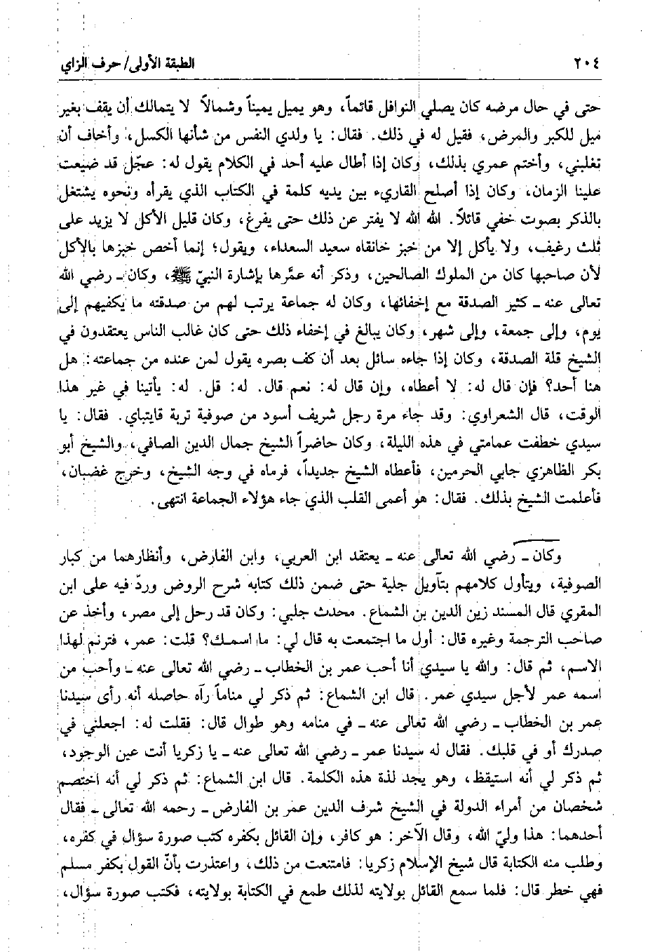 وكان - رضي الله تعالى عنه - يعتقد ابن العربي، وابن الفارض، وأنظارهما من كبار الصوفية، ويتأول كلامهم بتآويل جلية حتى ضمن ذلك كتابه شرح الروض ورد فيه على ابن المقري قال المسند زين الدين بن الشماع. محدث جلبي: وكان قد رحل إلى مصر، وأخذ عن صاحب الترجمة وغيره قال: أول ما اجتمعت به قال لي: ما اسمك؟ قلت: عمر، فترنم لهذا الاسم، ثم قال: والله يا سيدي أنا أحب عمر بن الخطاب - رضي الله تعالى عنه - وأحب من اسمه عمر لأجل سيدي عمر. قال ابن الشماع: ثم ذكر لي مناماً رآه حاصله أنه رأى سيدنا عمر بن الخطاب - رضي الله تعالى عنه - في منامه وهو طوال قال: فقلت له: اجعلني في صدرك أو في قلبك. فقال له سيدنا عمر - رضي الله تعالى عنه - يا زكريا أنت عين الوجود، ثم ذكر لي أنه استيقظ، وهو يجد لذة هذه الكلمة. قال ابن الشماع: ثم ذكر لي أنه اختصم شخصان من أمراء الدولة في الشيخ شرف الدين عمر بن الفارض - رحمه الله تعالى - فقال أحدهما: هذا ولي الله، وقال الآخر: هو كافر، وإن القائل بكفره كتب صورة سؤال في كفره، وطلب منه الكتابة قال شيخ الإسلام زكريا: فامتنعت من ذلك، واعتذرت بأن القول بكفر مسلم هي خطر قال: فلما سمع القائل بولايته لذلك طمع في الكتابة بولايته، فكتب صورة سؤال،