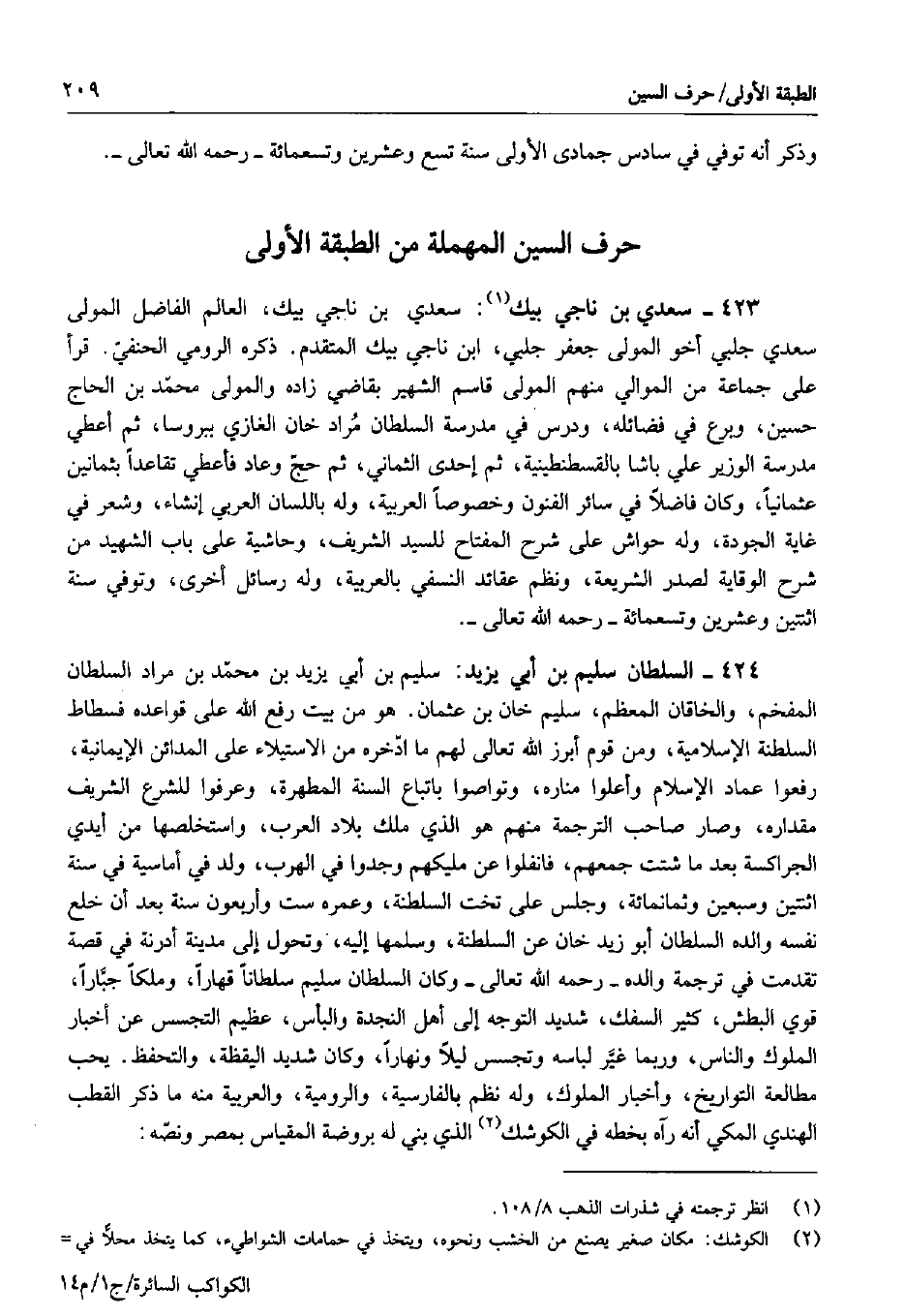 من الطبقة الأولى: 423 - سعدي بن ناجي بيك: سعدي بن ناجي بيك، العالم الفاضل المولى سعدي جلبي أخو المولى جعفر جلبي، ابن ناجي بيك المتقدم. ذكره الرومي الحنفي. قرأ على جماعة من الموالي منهم المولى قاسم الشهير بقاضي زاده والمولى محمد بن الحاج حسين، وبرع في فضائله، ودرس في مدرسة السلطان مراد خان الغازي ببروسا، ثم أعطي مدرسة الوزير علي باشا بالقسطنطينية، ثم إحدى الثماني، ثم حج وعاد فأعطي تقاعداً بثمانين عثمانياً، وكان فاضلاً في سائر الفنون وخصوصاً العربية، وله باللسان العربي إنشاء، وشعر في غاية الجودة، وله حواش على شرح المفتاح للسيد الشريف، وحاشية على باب الشهيد من شرح الوقاية لصدر الشريعة، ونظم عقائد النسفي بالعربية، وله رسائل أخرى، وتوفي سنة اثنتين وعشرين وتسعمائة - رحمه الله تعالى -.