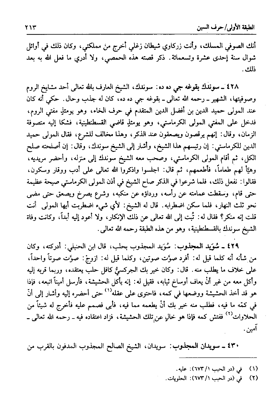 429 - سويد المجذوب: سويد المجذوب بحلب، قال ابن الحنبلي: أدركته، وكان من شأنه أنه كلما قيل له: أفرد صوت صوتين، وكلما قيل له: ازوج: صوت صوتاً واحداً على خلاف ما يطلب منه. قال: وكان خير بك الجركسي كافل حلب يعتقده، وربما قربه إليه وأكل معه من غير أن يعاف أوساخ ثيابه، فقيل له: إنه يأكل الحشيشة، فأرسل أميناً اتبعه، فإذا هو قد أخذ الحشيشة ووضعها في كمه، فاحتوى على عقله حتى أحضره إليه وأشار إلى أن في كمه ما فيه، فطلب منه خير بك أن يطعمه مما فيه، فأبى فصمم عليه فأخرج له شيئاً من الحلاوات ففتش كمه فإذا هو خال عن تلك الحشيشة، فزاد اعتقاده فيه - رحمه الله تعالى آمين.
