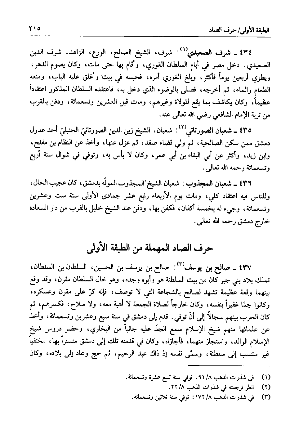 من الطبقة الأولى: 437 - صالح بن يوسف: صالح بن يوسف بن الحسين، السلطان بن السلطان، تملك بلاد بني جبر كان من بيت السلطنة هو وأبوه وجده، وهو خال السلطان مقرن، وقد وقع بينهما وقعة عظيمة تشهد لصالح بالشجاعة التي لا توصف، فإنه كر على مقرن وعسكره، وكانوا جما غفيراً بنفسه، وكان خارجاً لصلاة الجمعة لا أهبة معه، ولا سلاح، فكسرهم، ثم كان الحرب بينهم سجالاً إلى أن توفي. قدم إلى دمشق في سنة سبع وعشرين وتسعمائة، وأخذ عن علمائها منهم شيخ الإسلام سمع الجد عليه جانباً من البخاري، وحضر دروس شيخ الإسلام الوالد، واستجاز منهما، فأجازاه، وكان في قدمته تلك إلى دمشق متستراً بها، مختفياً غير منتسب إلى سلطنة، وسمى نفسه إذ ذاك عبد الرحيم، ثم حج وعاد إلى بلاده، وكان