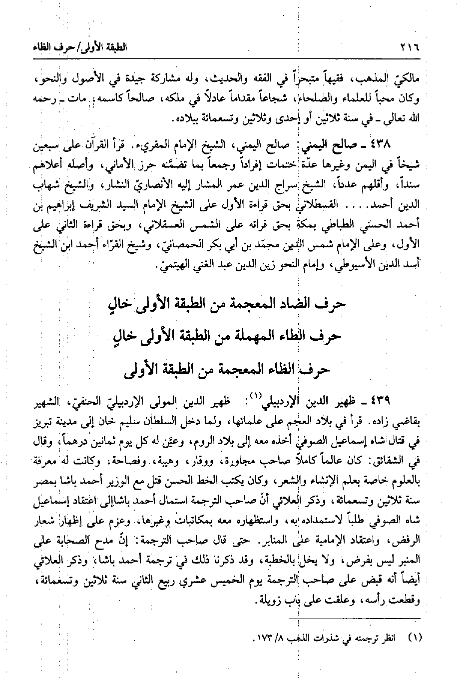 439 - ظهير الدين الإردبيلي: ظهير الدين المولى الإردبيلي الحنفي، الشهير بقاضي زاده. قرأ في بلاد العجم على علمائها، ولما دخل السلطان سليم خان إلى مدينة تبريز في قتال شاه إسماعيل الصوفي أخذه معه إلى بلاد الروم، وعين له كل يوم ثمانين درهماً، وقال في الشقائق: كان عالماً كاملاً صاحب مجاورة، ووقار، وهيبة، وفصاحة، وكانت له معرفة بالعلوم خاصة بعلم الإنشاء والشعر، وكان يكتب الخط الحسن قتل مع الوزير أحمد باشا بمصر سنة ثلاثين وتسعمائة، وذكر العلائي أن صاحب الترجمة استمال أحمد باشا إلى اعتقاد إسماعيل شاه الصوفي طلباً لاستمداده به، واستظهاره معه بمكاتبات وغيرها، وعزم على إظهار شعار الرفض، واعتقاد الإمامية على المنابر. حتى قال صاحب الترجمة: إن مدح الصحابة على المنبر ليس بفرض، ولا يخل بالخطبة، وقد ذكرنا ذلك في ترجمة أحمد باشا، وذكر العلائي أيضاً أنه قبض على صاحب الترجمة يوم الخميس عشري ربيع الثاني سنة ثلاثين وتسعمائة، وقطعت رأسه، وعلقت على باب زويلة.