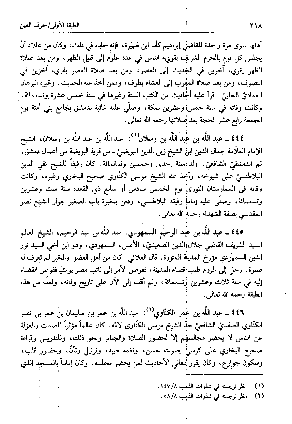 444 - عبد الله بن عبد الله بن رسلان: عبد الله بن عبد الله بن رسلان، الشيخ الإمام العلامة جمال الدين ابن الشيخ زين الدين البويضي - من قرية البويضة من أعمال دمشق، ثم الدمشقي الشافعي. ولد سنة إحدى وخمسين وثمانمائة. كان رفيقاً للشيخ تقي الدين البلاطنسي على شيوخه، وأخذ عنه الشيخ موسى الكناوي صحيح البخاري وغيره، وكانت وفاته في البيمارستان النةوري يوم الخميس سادس أو سابع ذي القعدة سنة ست وعشرين وتسعمائة، وصلى عليه إماماً رفيقه البلاطنسي، ودفن بمقبرة باب الصغير جوار الشيخ نصر المقدسي بصفة الشهداء رحمه الله تعالى.