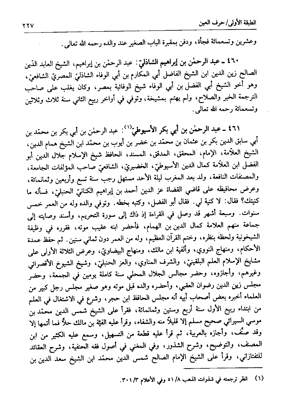 461 - عبد الرحمن بن أبي بكر الأسيوطي: عبد الرحمن بن أبي بكر بن محمد بن أبي سابق الدين بكر بن عثمان بن محمد بن خضر بن أيوب بن محمد ابن الشيخ همام الدين، الشيخ العلامة، الإمام، المحقق، المدقق، المسند، الحافظ شيخ الإسلام جلال الدين أبو الفضل ابن العلامة كمال الدين الأسيوطي، الخضيري، الشافعي صاحب المؤلفات الجامعة، والمصنفات النافعة، ولد بعد المغرب ليلة الأحد مستهل رجب سنة تسع وأربعين وثمانمائة، وعرض محافيظه على قاضي القضاة عز الدين أحمد بن إبراهيم الكناني الحنبلي، فسأله ما كنيتك؟ فقال: لا كنية لي. فقال أبو الفضل، وكتبه بخطه. وتوفي والده وله من العمر خمس سنوات. وسبعة أشهر قد وصل في القراءة إذ ذاك إلى سورة التحريم، وأسند وصايته إلى جماعة منهم العلامة كمال الدين بن الهمام، فأحضر ابنه عقيب موته، فقرره في وظيفة الشيخونية ولحظه بنظره، وختم القرآن العظيم، وله من العمر دون ثماني سنين. ثم حفظ عمدة الأحكام، ومنهاج النووي، وألفية ابن مالك، ومنهاج البيضاوي، وعرض الثلاثة الأولى على مشايخ الإسلام العلم البلقيني، والشرف المناوي، والعز الحنبلي، وشيخ الشيوخ الأقصرائي وغيرهم، وأجازوه، وحضر مجالس الجلال المحلي سنة كاملة يومين في الجمعة، وحضر مجلس زين الدين رضوان العقبي، وأحضره والده قبل موته وهو صغير مجلس رجل كبير من العلماء أخبره بعض أصحاب أبيه أنه مجلس الحافظ ابن حجر، وشرع في الاشتغال في العلم من ابتداء ربيع الأول سنة أربع وستين وثمانمائة، فقرأ على الشيخ شمس الدين محمد بن موسي السيرائي صحيح مسلم إلا قليلاً منه والشفاء، وقرأ عليه الفية بن مالك حلاً فما أتمها إلا وقد صنف، وأجازه بالعربية، ثم قرأ عليه قطعة من التسهيل، وسمع عليه الكثير من ابن المصنف، والتوضيح، وشرح الشذور، وفي المغني في أصول فقه الحنفية، وشرح العقائد للتفتازاني، وقرأ على الشيخ الإمام الصالح شمس الدين محمد ابن الشيخ سعد الدين بن