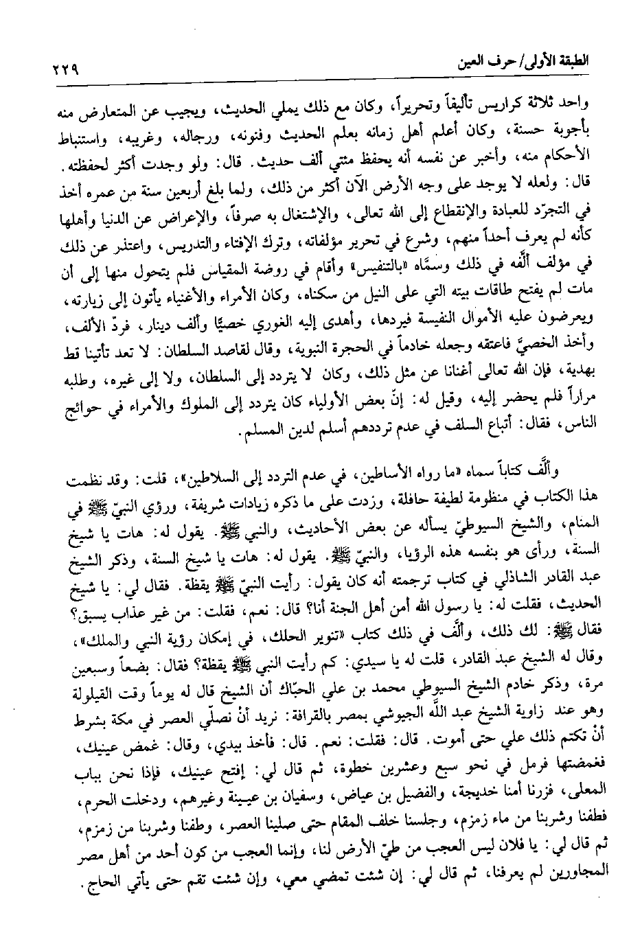 هذا الكتاب في منظومة لطيفة حافلة، وزدت على ما ذكره زيادات شريفة، ورؤي النبي صلى الله عليه وسلم في المنام، والشيخ السيوطي يسأله عن بعض الأحاديث، والنبي صلى الله عليه وسلم. يقول له: هات يا شيخ السنة، ورأى هو بنفسه هذه الرؤيا، والنبي صلى الله عليه وسلم. يقول له: هات يا شيخ السنة، وذكر الشيخ عبد القادر الشاذلي في كتاب ترجمته أنه كان يقول: رأيت النبي صلى الله عليه وسلم يقظة. فقال لي: يا شيخ الحديث، فقلت له: يا رسول الله أمن أهل الجنة أنا؟ قال: نعم، فقلت: من غير عذاب يسبق؟ فقال صلى الله عليه وسلم: لك ذلك، وألف في ذلك كتاب " تنوير الحلك، في إمكان رؤية النبي والملك "، وقال له الشيخ عبد القادر، قلت له يا سيدي: كم رأيت النبي صلى الله عليه وسلم يقظة؟ فقال: بضعاً وسبعين مرة، وذكر خادم الشيخ السيوطي محمد بن علي الحباك أن الشيخ قال له يوماً وقت القيلولة وهو عند زاوية الشيخ عبد الله الجيوشي بمصر بالقرافة: نريد أن نصلي العصر في مكة بشرط أن تكتم ذلك علي حتى أموت. قال: فقلت: نعم. قال: فأخذ بيدي، وقال: غمض عينيك، فغمضتها فرمل في نحو سبع وعشرين خطوة، ثم قال لي: إفتح عينيك، فإذا نحن بباب المعلى، فزرنا أمنا خديجة، والفضيل بن عياض، وسفيان بن عيينة وغيرهم، ودخلت الحرم، فطفنا وشربنا من ماء زمزم، وجلسنا خلف المقام حتى صلينا العصر، وطفنا وشربنا من زمزم، ثم قال لي: يا فلان ليس العجب من طيئ الأرض لنا، وإنما العجب من كون أحد من أهل مصر المجاورين لم يعرفنا، ثم قال لي: إن شئت تمضي معي، وإن شئت تقم حتى يأتي الحاج.