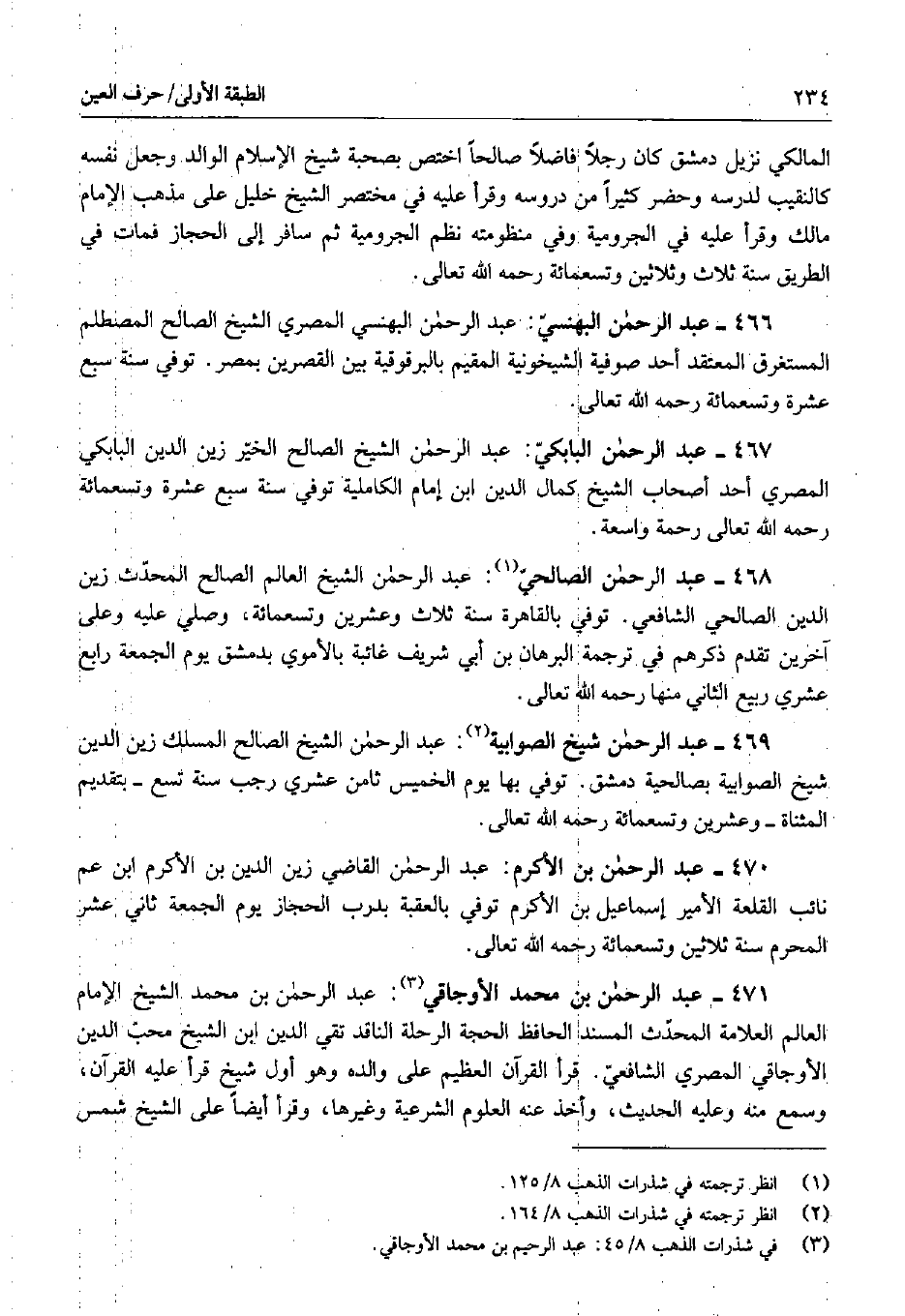 468 - عبد الرحمن الصالحي: عبد الرحمن الشيخ العالم الصالح المحدث زين الدين الصالحي الشافعي. توفي بالقاهرة سنة ثلاث وعشرين وتسعمائة، وصلي عليه وعلى آخرين تقدم ذكرهم في ترجمة البرهان بن أبي شريف غائبة بالأموي بدمشق يوم الجمعة رابع عشري ربيع الثاني منها رحمه الله تعالى.