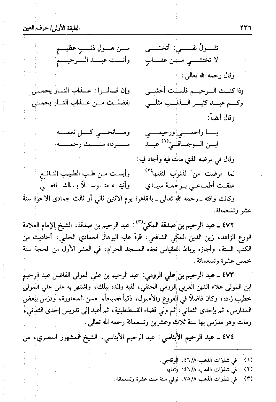 472 - عبد الرحيم بن صدقة المكي: عبد الرحيم بن صدقة، الشيخ الإمام العلامة الورع الزاهد، زين الدين المكي الشافعي، قرأ عليه البرهان العمادي الحلبي، أحاديث من الكتب الستة، وأجازه برباط المقياس تجاه المسجد الحرام، في العشر الأول من الحجة سنة خمس عشرة وتسعمائة.