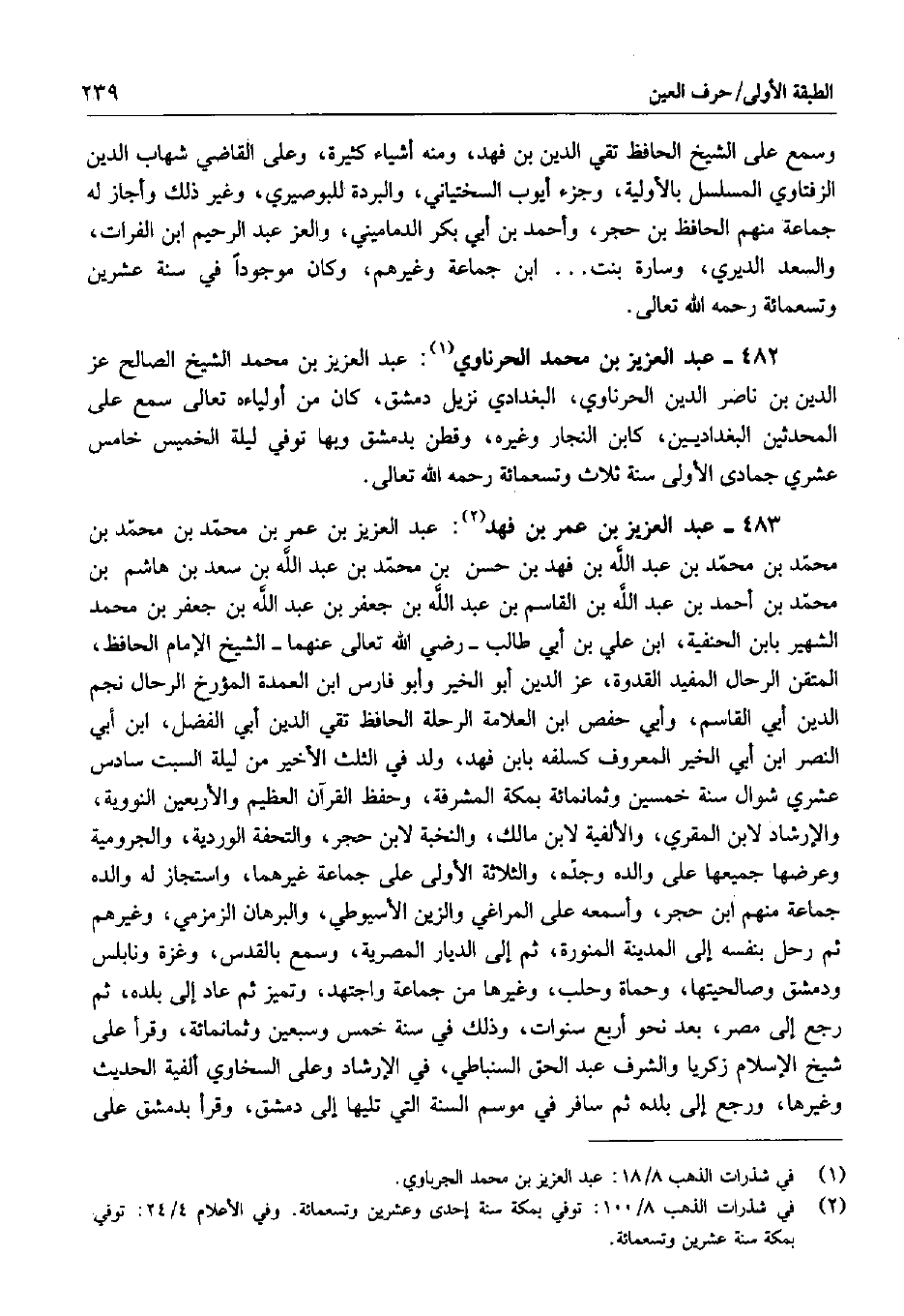 483 - عبد العزيز بن عمر بن فهد: عبد العزيز بن عمر بن محمد بن محمد بن محمد بن محمد بن عبد الله بن فهد بن حسن بن محمد بن عبد الله بن سعد بن هاشم بن محمد بن أحمد بن عبد الله بن القاسم بن عبد الله بن جعفر بن عبد الله بن جعفر بن محمد الشهير بابن الحنفية، ابن علي بن أبي طالب - رضي الله تعالى عنهما - الشيخ الإمام الحافظ، المتقن الرحال المفيد القدوة، عز الدين أبو الخير وأبو فارس ابن العمدة المؤرخ الرحال نجم الدين أبي القاسم، وأبي حفص ابن العلامة الرحلة الحافظ تقي الدين أبي الفضل، ابن أبي النصر ابن أبي الخير المعروف كسلفه بابن فهد، ولد في الثلث الأخير من ليلة السبت سادس عشري شوال سنة خمسين وثمانمائة بمكة المشرفة، وحفظ القرآن العظيم والأربعين النووية، والإرشاد لابن المقري، والألفية لابن مالك، والنخبة لابن حجر، والتحفة الوردية، والجرومية وعرضها جميعها على والده وجده، والثلاثة الأولى على جماعة غيرهما، واستجاز له والده جماعة منهم ابن حجر، وأسمعه على المراغي والزين الأسيوطي، والبرهان الزمزمي، وغيرهم ثم رحل بنفسه إلى المدينة المنورة، ثم إلى الديار المصرية، وسمع بالقدس، وغزة ونابلس ولدمشق وصالحيتها، وحماة وحلب، وغيرها من جماعة واجتهد، وتميز ثم عاد إلى بلده، ثم رجع إلى مصر، بعد نحو أربع سنوات، وذلك في سنة خمس وسبعين وثمانمائة، وقرأ على شيخ الإسلام زكريا والشرف عبد الحق السنباطي، في الإرشاد وعلى السخاوي ألفية الحديث وغيرها، ورجع إلى بلده ثم سافر في موسم السنة التي تليها إلى دمشق، وقرأ بدمشق على