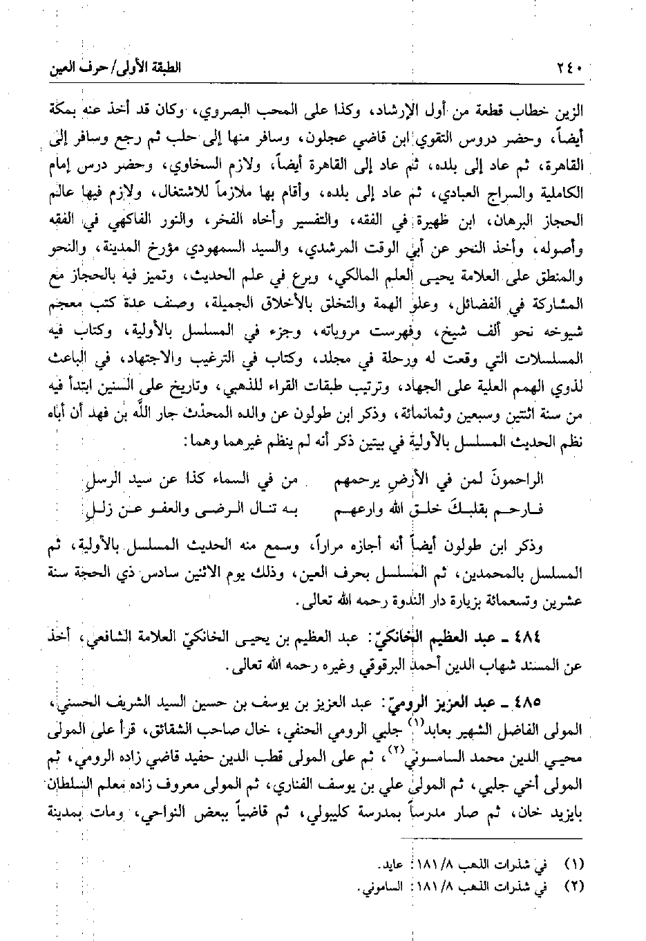 484 - عبد العظيم الخانكي: عبد العظيم بن يحيى الخانكي العلامة الشافعي، أخذ عن المسند شهاب الدين أحمد البرقوقي وغيره رحمه الله تعالى.