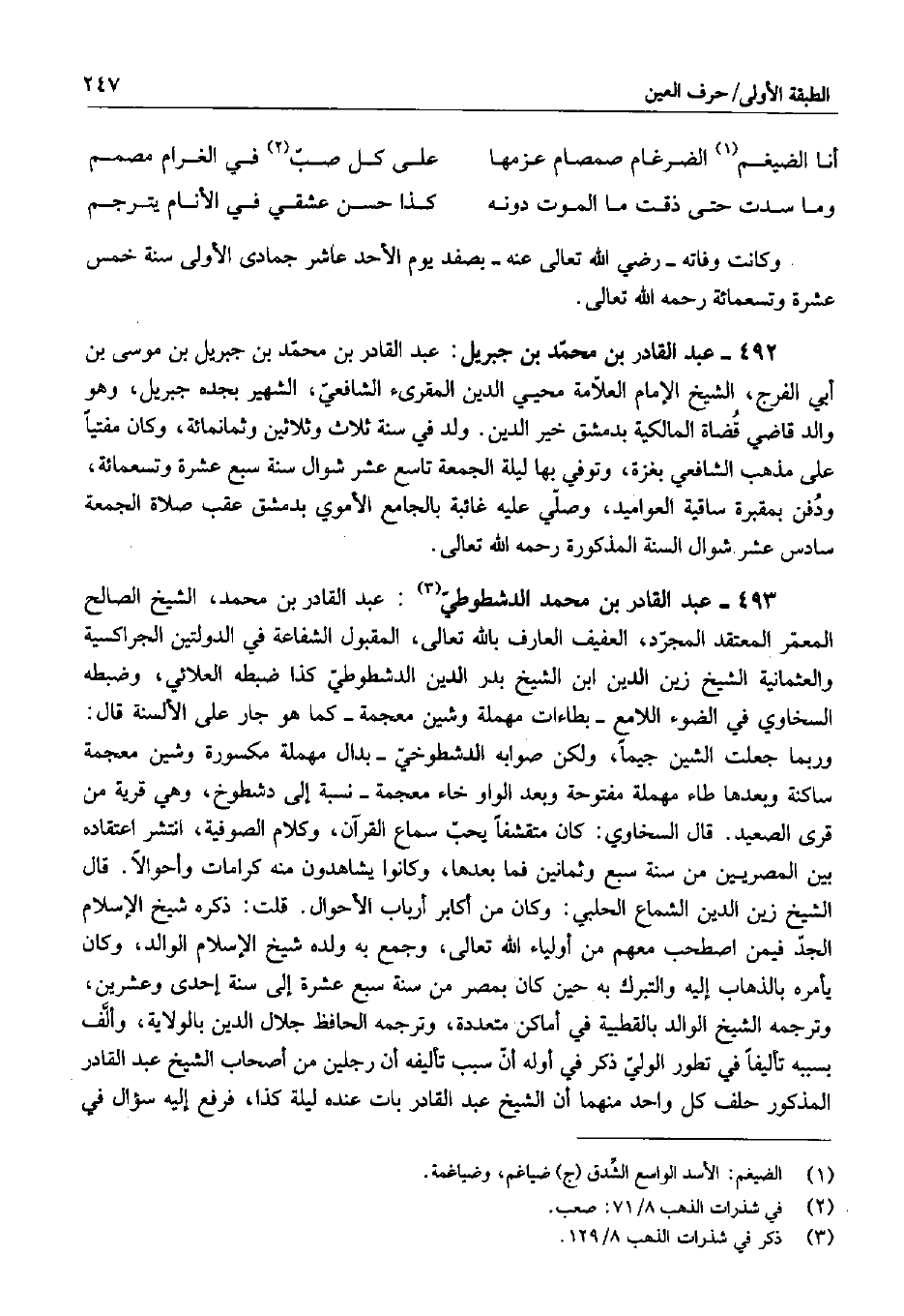 493 - عبد القادر بن محمد الدشطوطي: عبد القادر بن محمد، الشيخ الصالح المعمر المعتقد المجرد، العفيف العارف بالله تعالى، المقبول الشفاعة في الدولتين الجراكسية والعثمانية الشيخ زين الدين ابن الشيخ بدر الدين المشطوطي كذا ضبطه العلائي، وضبطه السخاوي في الضوء اللامع - بطاءات مهملة وشين معجمة - كما هو جار على الألسنة قال: وربما جعلت الشين جيماً، ولكن صوابه الدشطوخي - بدال مهملة مكسورة وشين معجمة ساكنة وبعدها طاء مهملة مفتوحة وبعد الواو خاء معجمة - نسبة إلى دشطوخ، وهي قرية من قرى الصعيد. قال السخاوي: كان متقشفاً يحب سماع القرآن، وكلام الصوفية، انتشر اعتقاده بين المصريين من سنة سبع وثمانين فما بعدها، وكانوا يشاهدون منه كرامات وأحوالاً. قال الشيخ زين الدين الشماع الحلبي: وكان من أكابر أرباب الأحوال. قلت: ذكره شيخ الإسلام الجد فيمن اصطحب معهم من أولياء الله تعالى، وجمع به ولده شيخ الإسلام الوالد، وكان يأمره بالذهاب إليه والتبرك به حين كان بمصر من سنة سبع عشرة إلى سنة إحدى وعشرين، وترجمه الشيخ الوالد بالقطبية في أماكن متعددة، وترجمه الحافظ جلال الدين بالولاية، وألف بسببه تأليفاً في تطور الولي ذكر في أوله أن سبب تأليفه أن رجلين من أصحاب الشيخ عبد القادر المذكور حلف كل واحد منهما أن الشيخ عبد القادر بات عنده ليلة كذا، فرفع إليه سؤال في