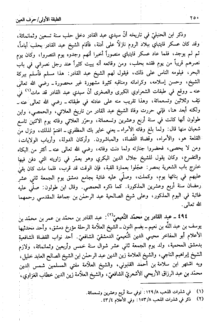 494 - عبد القادر بن محمد النعيمي: عبد القادر بن محمد بن عمر بن محمد بن يوسف بن عبد الله بن نعيم - بضم النون - الشيخ العلامة الرحلة مؤرخ دمشق، وأحد محدثيها الأعلام أبو المفاخر محيي الدين النعيمي الدمشقي الشافعي. أحد نواب القضاة الشافعية بدمشق المحمية، ولد يوم الجمعة ثاني عشر شوال سنة خمس وأربعين وثمانمائة، ولازم الشيخ إبراهيم الناجي، والشيخ العلامة زين الدين عبد الرحمن ابن الشيخ الصالح العابد خليل، وبه اشتهر ابن سلامة بن أحمد القابوني، والشيخ العلامة مفتي المسلمين شمس الدين محمد بن عبد الرزاق الأريحي الأشعري الشافعي، والشيخ العلامة زين الدين خطاب الغزاوي،