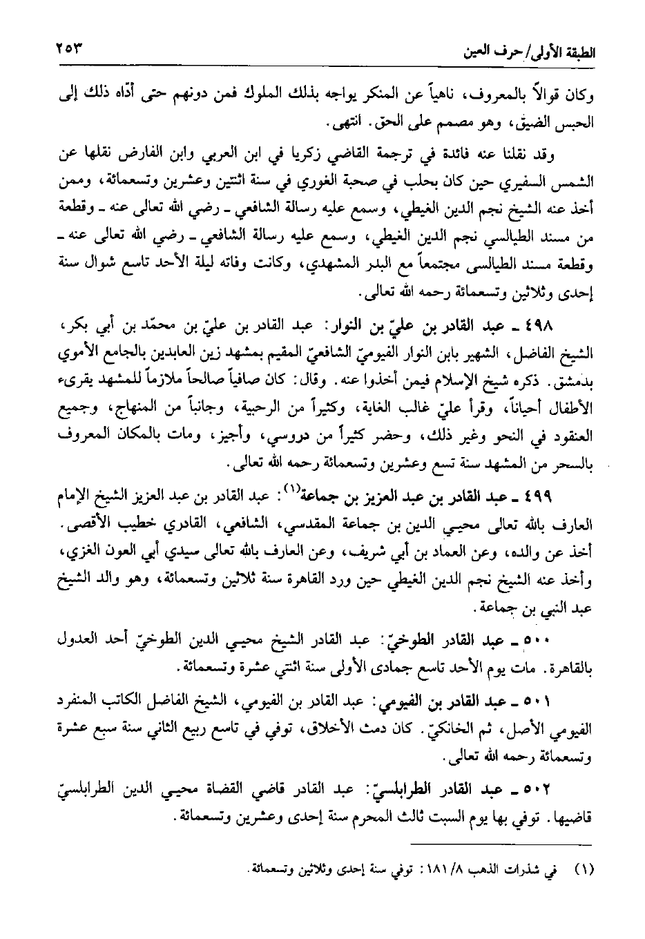 501 - عبد القادر بن الفيومي: عبد القادر بن الفيومي، الشيخ الفاضل الكاتب المنفرد الفيومي الأصل، ثم الخانكي. كان دمث الأخلاق، توفي في تاسع ربيع الثاني سنة سبع عشرة وتسعمائة رحمه الله تعالى.